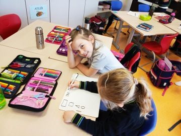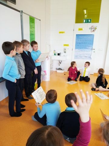 Hledali příklady kolem sebe a zapisovali je do tabulky. Pracovali v týmu a společně i prezentovali. Někteří studenti se již pustili i do 3D tvarů. Na závěr hodiny vytvářeli z tvarů barevné kompozice, které během týdne ještě dotvoří.