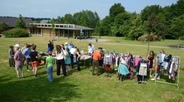 Ale pěkně popořádku. Jak k tomu došlo? Na úplném začátku bylo přání Kristýny Šmerdové z tercie A nějak pomoci lidem v jedné z nejchudších zemí světa, v Nepálu, které na konci dubna postihlo katastrofální zemětřesení. Po mých počátečních skeptických reakcích nás nakonec společně napadlo, že bychom mohli zorganizovat bazar oblečení. Skoro každá holka chodí do sekáče, kde si ráda pořizuje „nové“ oblečení, no ne? Myšlenka byla prostá: každý obětuje pár kousků ze svého šatníku a pár jiných si koupí. Výtěžek nepůjde ovšem jemu do kapsy, ale na konto SOS Nepál Člověka v tísni. Jednoduché jako facka. Prokonzultováno s lidmi z Člověka v tísni, s vedením školy, obesláni učitelé i studenti s žádostí o darování hezkého oblečení (svého či svých rodičů – to v případě studentů, samozřejmě) a nakonec stanoven nejvhodnější termín konání akce: Blue Van festival. Pomocnou ruku nabídla Monika Juchová, bazar se mezitím rozrostl i o další věci (knihy, hry, elektronika…). Organizace a popularizace celé věci se ujali samotní terciáni.