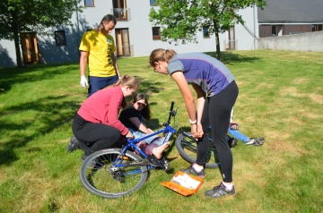 Po úspěšném splnění tohoto úkolu jsme se odebrali k druhému stanovišti, kde polehávaly dvě dívky, které se vybouraly na kole. Jedna měla obrovskou díru do nohy, ze které stříkala pro někoho až příliš realistická krev, a druhá měla hlubokou krvavou ránu v dlani. První dvojice, nedbajíc urputného řevu zraněné, přivázala figurantčinu nohu ke kolu, další jí do rány chtěla strčit mobilní telefon a třetí zareagovala až po několika kritických momentech, kdy se studentky jakoby schovávaly za lékárničku. Figurantka s masivním krvácením z dolní končetiny žádné z našich dvojic nepřežila a figurantku s vážně poraněnou rukou pro jistotu všichni přehlédli…
