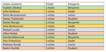Matematický klokan proběhl ve čtyřech kategoriích a nejúspěšnější řešitele najdete zde v tabulce: