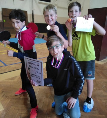 A tak se stalo. Naši bojovníci nezatížení vědomostmi o soupeřích vlétli ke stolům a postupně se pomazlili se ZŠ Komenského čili Komenkou (4:2), Starou Boleslaví (4:3), ZŠ Čelákovice I (4:3) a ZŠ Říčany (4:2). Již po prvním vítězství jsem dojatě na chlapce křičel z balkónu: „Nebuďte k nim příliš krutí!“ Ale týmová jednička Kryštof Kantor mě zřejmě špatně slyšel. K němu se přidal vynikajícím výkonem Toby Kučera, coby obranář a s Kryštofem tahoun naší čtyřhry. Maty Fryc a Jonáš Míkovec předvedli neuvěřitelné výměny, když nám teklo do bot, a zachránili pro OG důležité vítězné body.