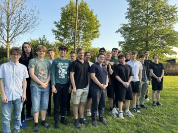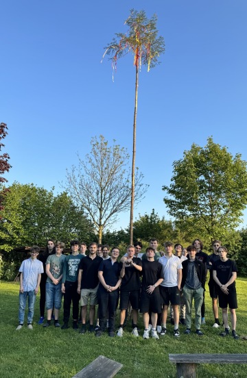 Neunavitelná byla skupina nejstarších mládensů (pominu-li maturanty, kteří teď na únavu mohou zapomenout) ze Zelené koleje, jelikož jejich letošním májovým posláním bylo postavení májky. To znamenalo ve středu ráno v pět s vychovatelem Michalem a panem hajným projít les (tímto děkujeme paní starostce Marks za zprostředkování dřevin), označit vhodné stromy, ty pokácet, pak dopravit v rukách 2 km do OG, vykopat díru ve skále, sehnat a ozdobit vršek májky, tu zasadit do země, udusat a opatřit podpěrami, zbylé klády pořezat na další táboráky... A pak konečně hurááá učit se na test z matematiky.