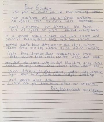 Naši čtvrťáci ve spolupráci s Janičkou v rámci hodin anglického jazyka napsali, popsali a nakreslili Gouthamovi naši novou uniformu, kdy se nosí slavnostní uniforma, kdy mohou mít neformální, a že mají zimní a letní verzi. Některé dopisy a obrázky jsme vám nafotili k tomuto článku, podívejte se, jak jim to šlo pěkně od ruky.