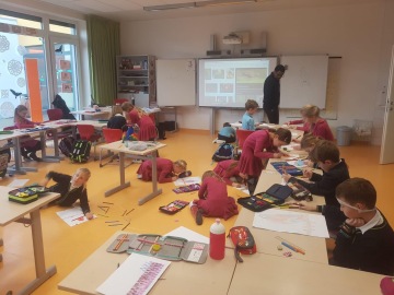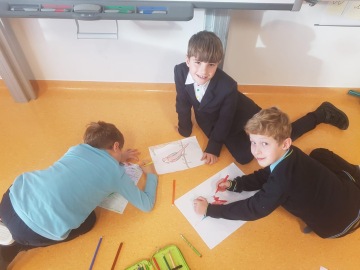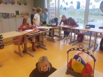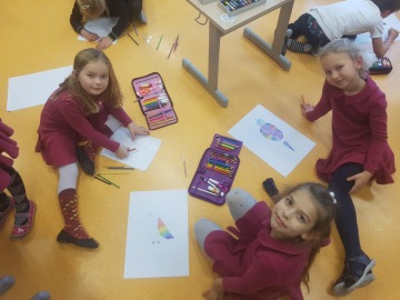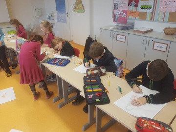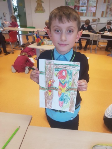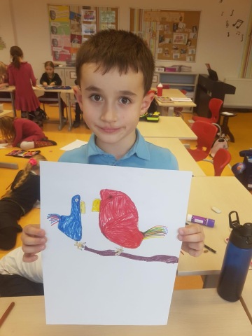 Během angličtiny jsme opakovali zvířata. Vyplnili jsme několik cvičení na téma papoušci - hovořili jsme o barvách a jednotlivých částech těla. Nechali jsme se inspirovat a každý si nakreslil barevného papouška suchými pastely.