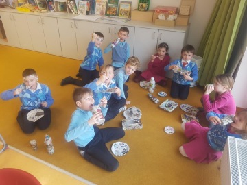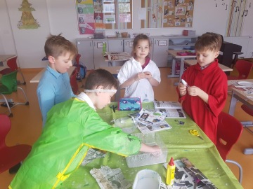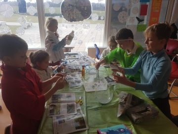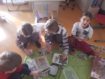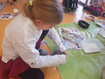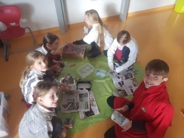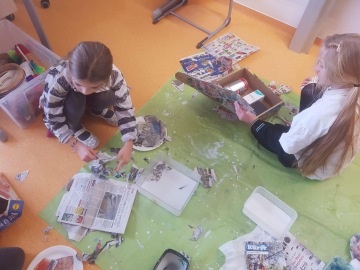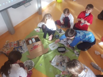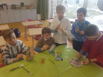 Druháci se během výtvarné výchovy pustili do trojrozměrné tvorby. Každý si podle své libosti přinesl předmět vhodný pro zpracování v technice kašírování. Ukázali jsme si jak na to a děti se s nadšením pustily do práce. Technika je velmi zaujala, krásně spolupracovaly a nakonec každý vytvořil předmětů víc. Během následující lekce pak ještě některé z předmětů pomalovaly akrylovými barvami.