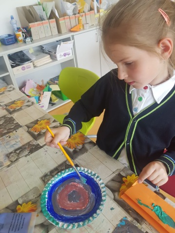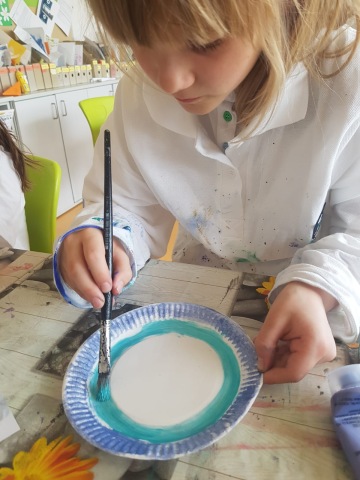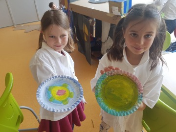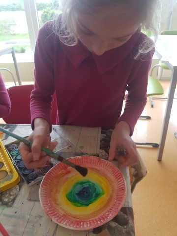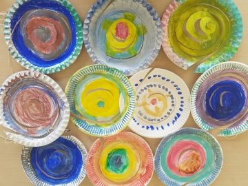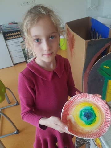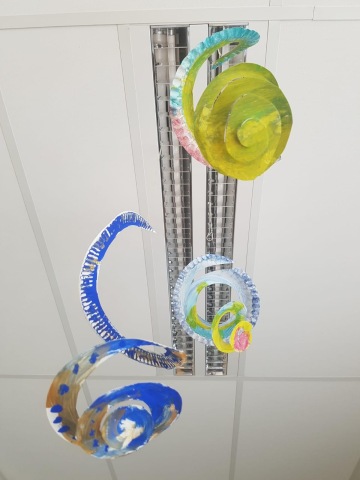 Nebojte se, ve družině nedošlo k žádné přírodní katastrofě, to se jen děti s velkou vervou a nasazením pustily do dalšího výtvarného tvoření. Tentokrát se chopily štětců a temperových barev a na papírové tácky malovaly své vlastní abstraktní kruhové kompozice. Nebály se míchat barvy a pracovat s různými odstíny, takže brzy vytvořily pestré obrazce. Po zaschnutí je pak již jen stačilo nastříhat do spirály a zavěsit na provázek ke stropu. Výsledný efekt je okouzlující, stačí malý průvan a všechna "tornáda" se roztočí.