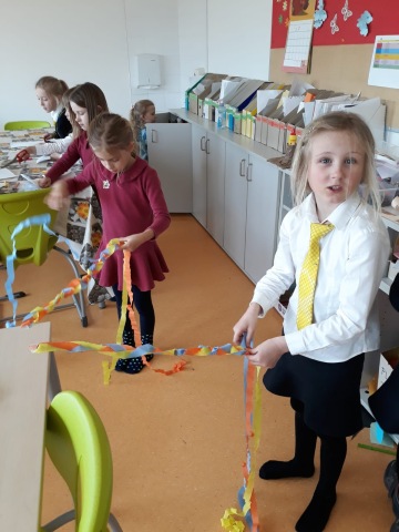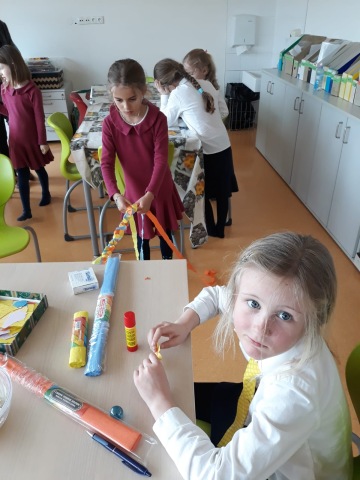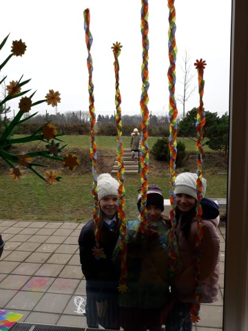 Z platíček vytváříme stojánky na vajíčka, do skořápek sázíme osení a řeřichu. Okna jsme nazdobili pletenými copánky z krepového papíru - výborný trénink pro pletení skutečných velikonočních pomlázek. Zkoušíme také barvit kraslice novými netradičními technikami.