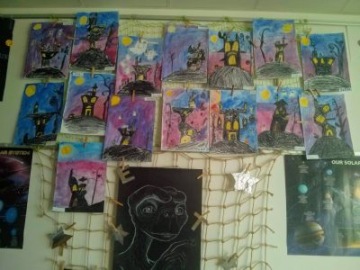 Classes 1 and 2 made some beautiful art for Halloween in their Arts and Culture lessons last week. Class 1 made Jack O’Lanterns out of coloured paper that you can see displayed on the classroom door. Class 2 made cool haunted houses, using wax crayons and watercolours. You can see them displayed in their classroom. Both projects turned out great and helped create the right spooky Halloween atmosphere at school!