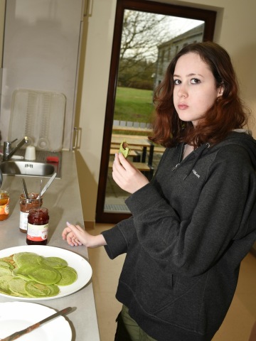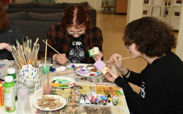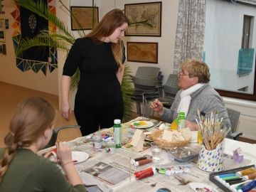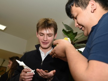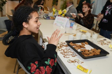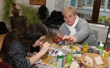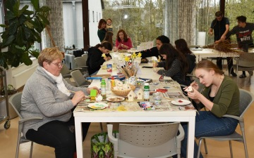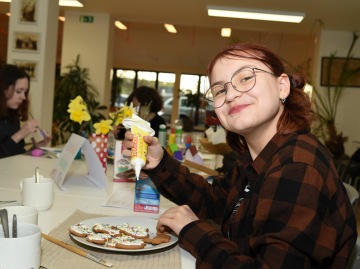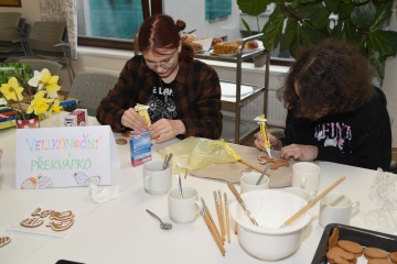 Studenti luštili křížovky, hráli hru, zdobili, malovali a jinak tvořili a zároveň pilně ochutnávali dobrůtky, s láskou upečené naší zdravotní sestřičkou. Co se týká nabídky aktivit, na své si určitě přišli tradicionalisté snažící se o upletení své první pomlázky v životě. Pomlázky z vrbového proutí se povedly na výbornou a můžeme jen doufat, že budou na Velikonoce v akci spíše jen symbolicky… Milovníci zvířat a fanoušci Harryho Pottera se zase mohli v areálu zúčastnit hry „Velikonoční zvířata a kde je najít.“ Zájemci o chvilku zastavení se při malování vydováděli u roztomilých chaloupek, které po zavěšení na větvičku vytvořily krásnou dekoraci. Svůj ostrovtip si u křížovek brousili studenti za hudebního doprovodu našeho nadaného vychovatele. Byl to vítaný podkres velikonočního odpoledne. Kdo by snad nevěděl, co je to vajíčkové Tamagotchi, mohl se buď rozpomenout na retro hračku stejného jména, nebo se zúčastnit setí řeřichy do vaječných skořápek, o něž bude nutné nějakou dobu pečovat pravidelnou zálivkou. Máte rádi překvápko? To naše velikonoční přineslo radost v podobě zdobení domácích perníčků a následného mlsání. Velkým hitem se staly Shrekovy palačinky a lívance, jejichž barvu snadno uhodnete. Jarní pohlazení přišlo v podobě pampelišek, které navodily jarní atmosféru bez ohledu na nečas za okny.