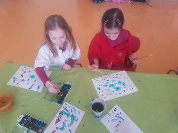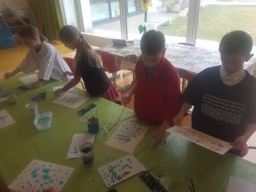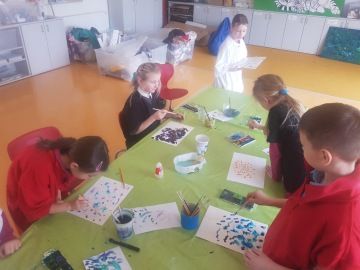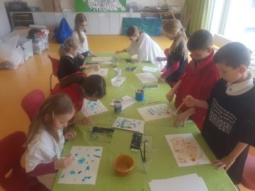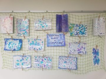 Děti na výtvarném volitelném předmětu zkoušely novou techniku. Rozpíjely anilínové barvy v klovatině. Tvorba je velmi zaujala, ale ze začátku malinko váhaly, jak na to. Bylo potřeba odhadnout správné množství lepidla a zároveň pracovat dostatečně rychle. Brzy však děti získaly dostatečnou zručnost a vytvořily několik zajímavě barevných kompozic.