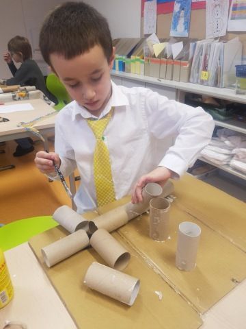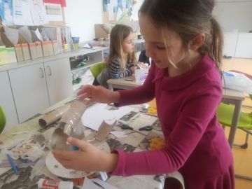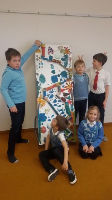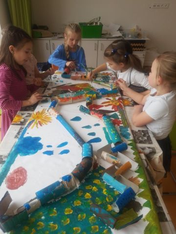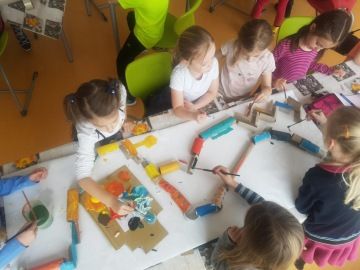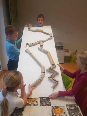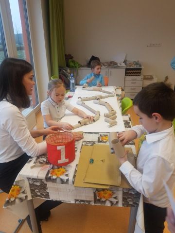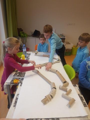 Během několika posledních dní jsme se v družině věnovali tvorbě kuličkové dráhy z kartonu a roliček. Velmi aktivně se tentokrát zapojili i kluci, s nadšením vymýšleli rafinované průjezdy, skoky, odbočky a výhybky. Aby dráha byla skutečně funkční, bylo třeba neustále zdokonalovat jednotlivé úseky. Proběhla celá řada zkušebních jízd, než jsme přistoupili k závěrečnému kolorování a instalaci. Některé děti se nechaly inspirovat k vytvoření své vlastní malé kuličkovky a hned si ji s nadšením odnášely domů.