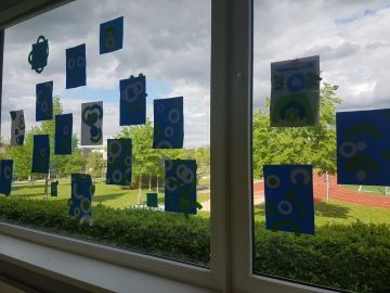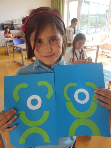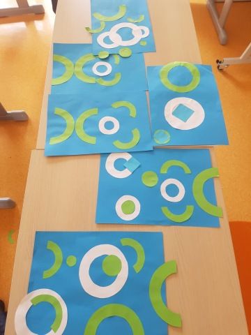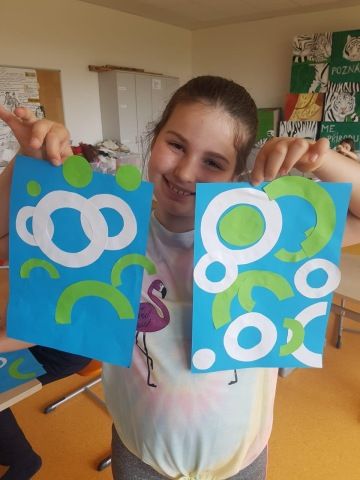 Inspirací pro tvorbu na minulé lekci výtvarných experimentů bylo logo naší školy. Úkolem dětí bylo vytvořit různé kompozice z daných prvků a v omezených barvách. Děti nejprve váhaly, nedovedly si představit, že by jednotlivé prvky loga poskládaly jiným způsobem. Po chvilce však začaly přicházet na to, jak rozmanitě mohou kompozice působit, pokud se jeden geometrický tvar v jejich práci objeví víckrát nebo pokud se nečekaným způsobem nakombinuje s jiným tvarem. Brzy tak začaly vznikat rozmanité kompozice, některé vyvážené a symetrické, jiné dynamické a hravě chaotické.