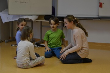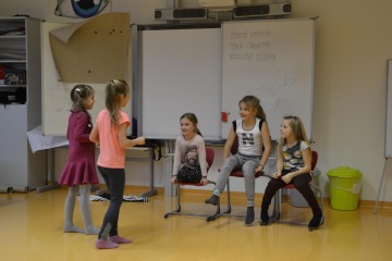 Poté jsme se opět pustili do skupinové připravené improvizace. Připravili jsme si ve skupinách a posléze sehráli hned několik pohádek. Jejich sehrání bylo pomyslnou tečkou celé lekce.