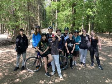 Po návratu na koleje nás čekala večeře a po krátké pauze jsme šli do bazénu hrát vodní pólo. Ze soboty na neděli jsme spali pod širákem, ačkoliv někteří nakonec radši využili bezpečí stanů. V neděli jsme jeli na cyklistický výlet po okolí Babic. Víte, že se ve zdejším lese nachází bikrosová dráha? Tu jsme museli vyzkoušet!