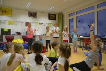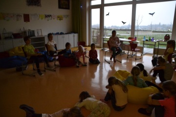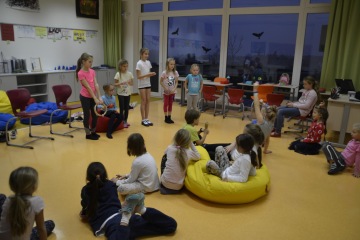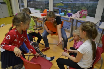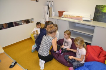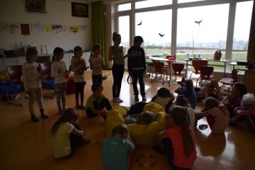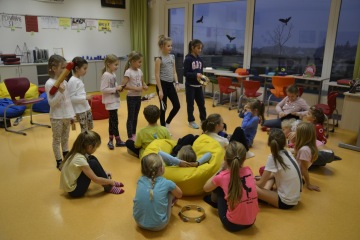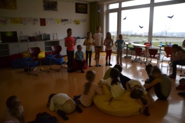 Na dalším dramaťáku jsme si povídali o našich tajných místech i o tom, proč vůbec nějaká tajná místa máme, k čemu je potřebujeme a jak je využíváme. Společně jsme se na jedno tajné místo také vypravili. Pustili jsme uzdu fantazii a představovali si, co by se asi tak mohlo nacházet za vysokou starou zdí porostlou psím vínem. Zkusili jsme i několik variant zvukových návštěv místa za zdí. Odhalili jsme, že za zdí se nachází obrovská zahrada a tu jsme si společně také ztvárnili.