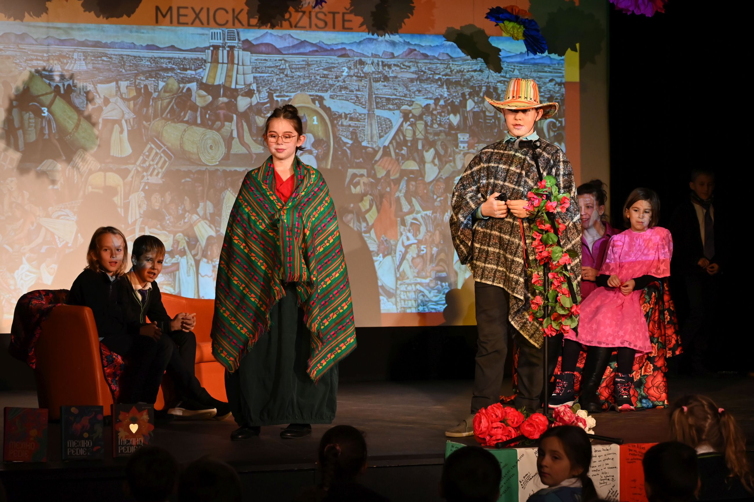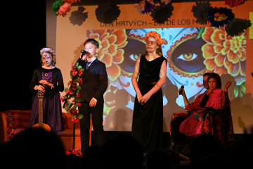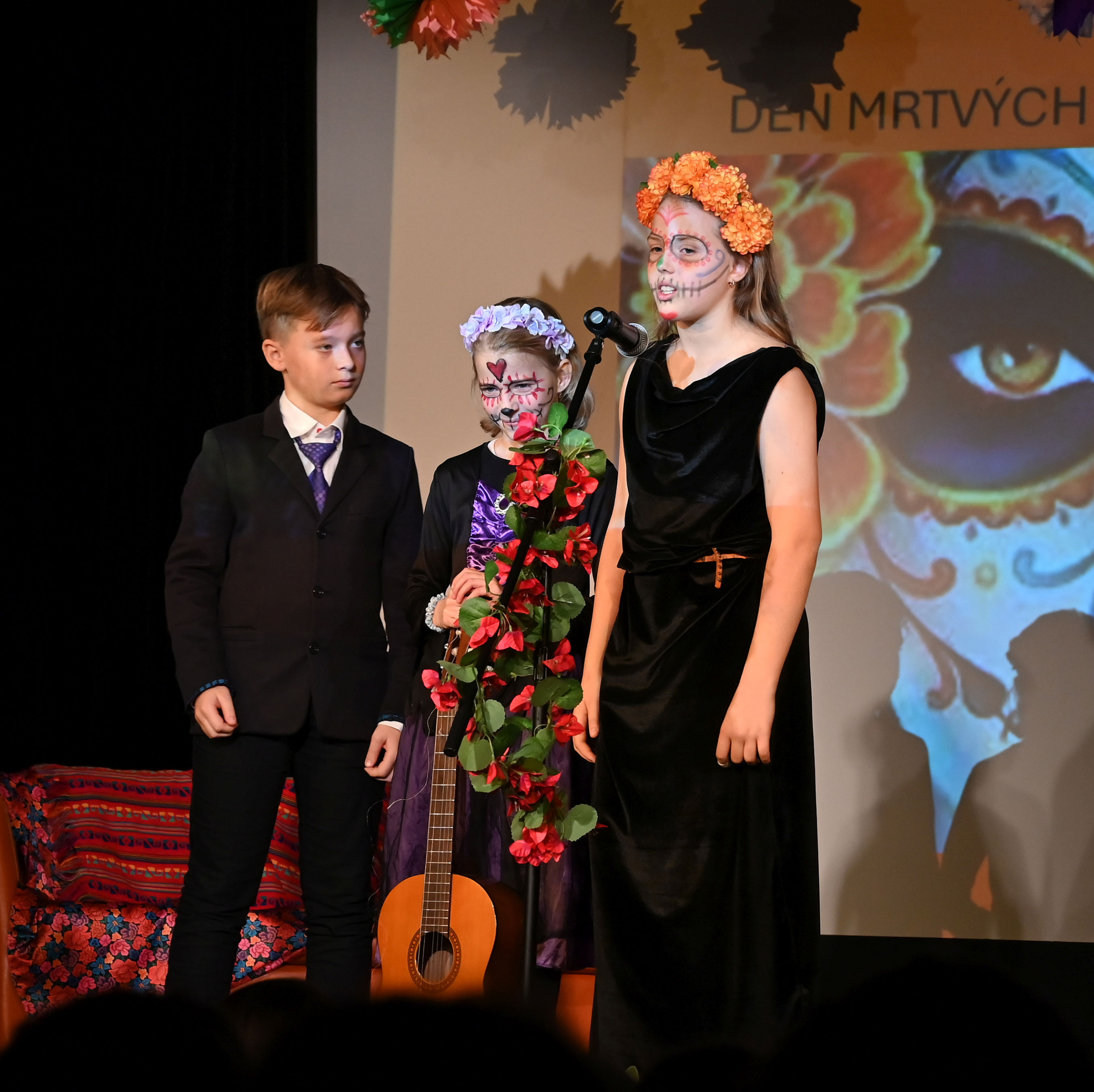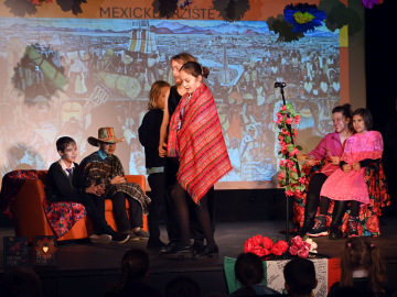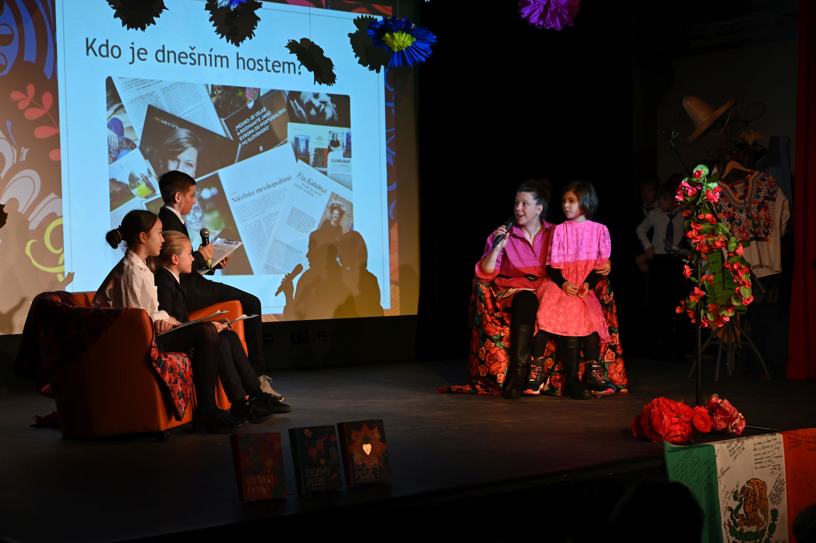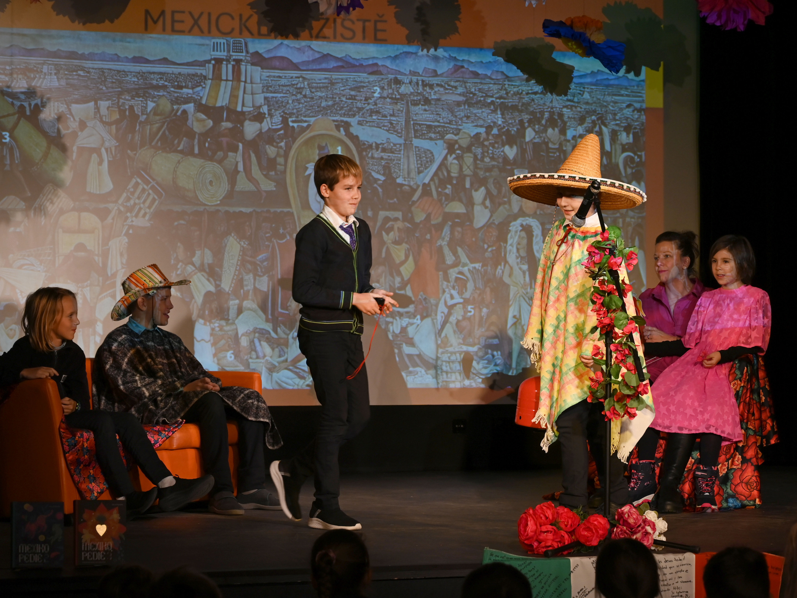 Středeční dopoledne naplnilo setkání na společné assembly v režii páté třídy. Hned při příchodu všechny okouzlila pestrobarevná scénografie plná dekorací květin, kaktusů, mexické vlajky a kostýmů. Povídat o Mexiku nám přišli ti nejpovolanější. Páťáci vyzpovídali historičku, spisovatelku a sběratelku mexických podivností Evu Kubátovou a její dceru Aničku, která se v Mexiku narodila. Dozvěděli jsme se nespočet zajímavých informací o mexické přírodě, kultuře, oblečení nebo jídle. V angličtině nám představili mexické dušičky a pobavili nás dramatizací prastaré legendy o vánoční hvězdě. Páťáci odvedli skvělou práci a do poutavého rozhovoru zapojili zpěv, tanec, divadlo i módní přehlídku.