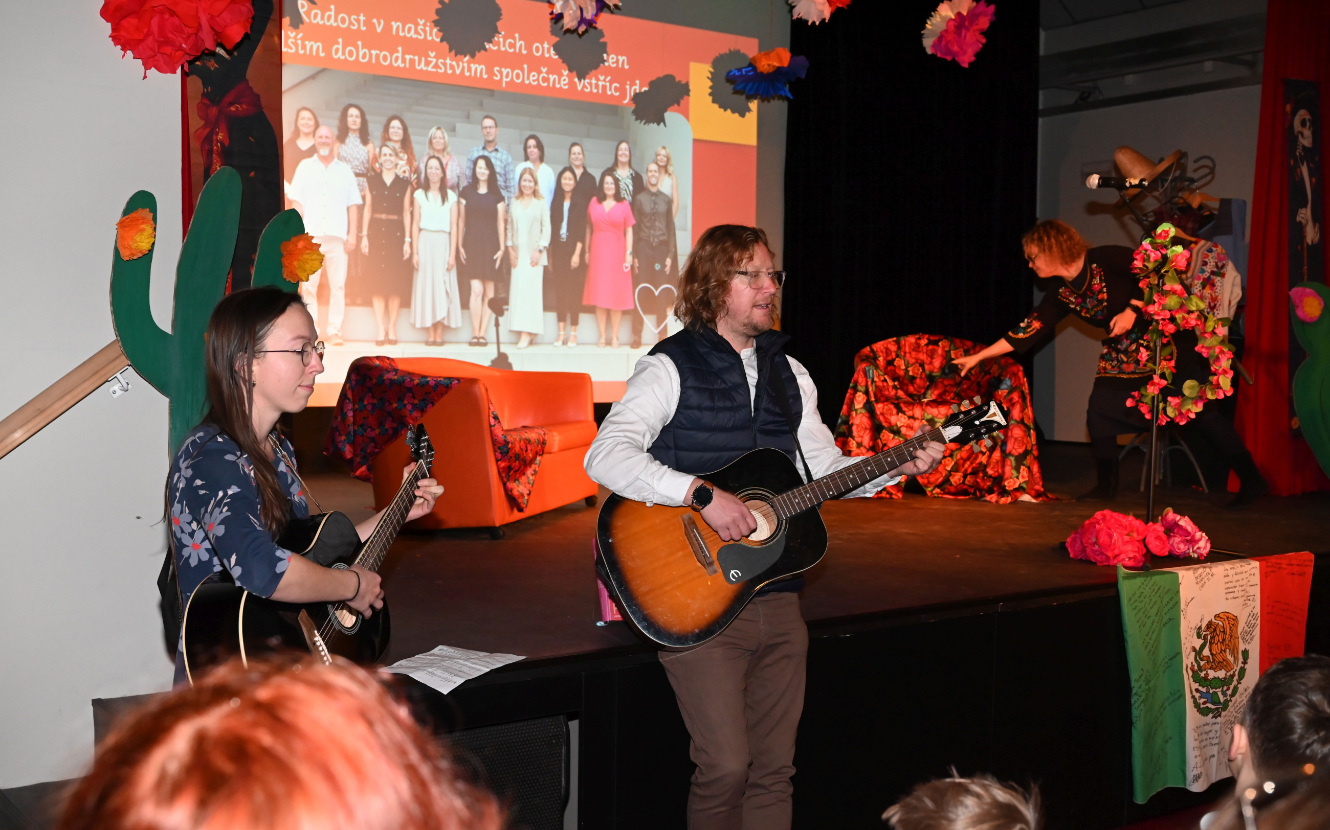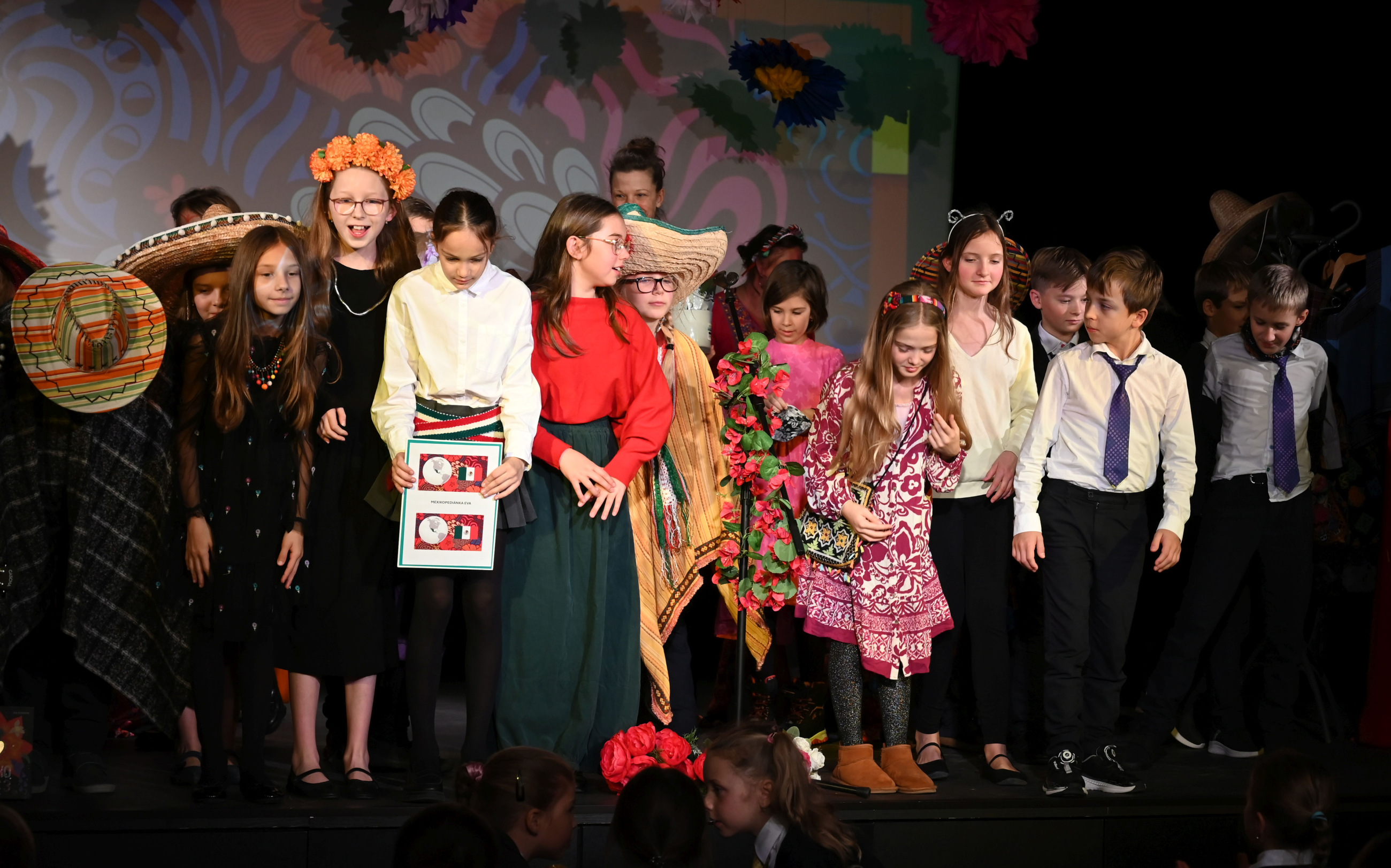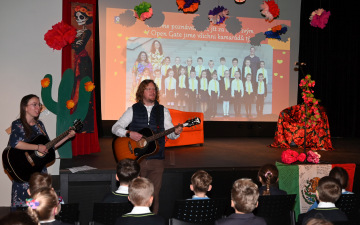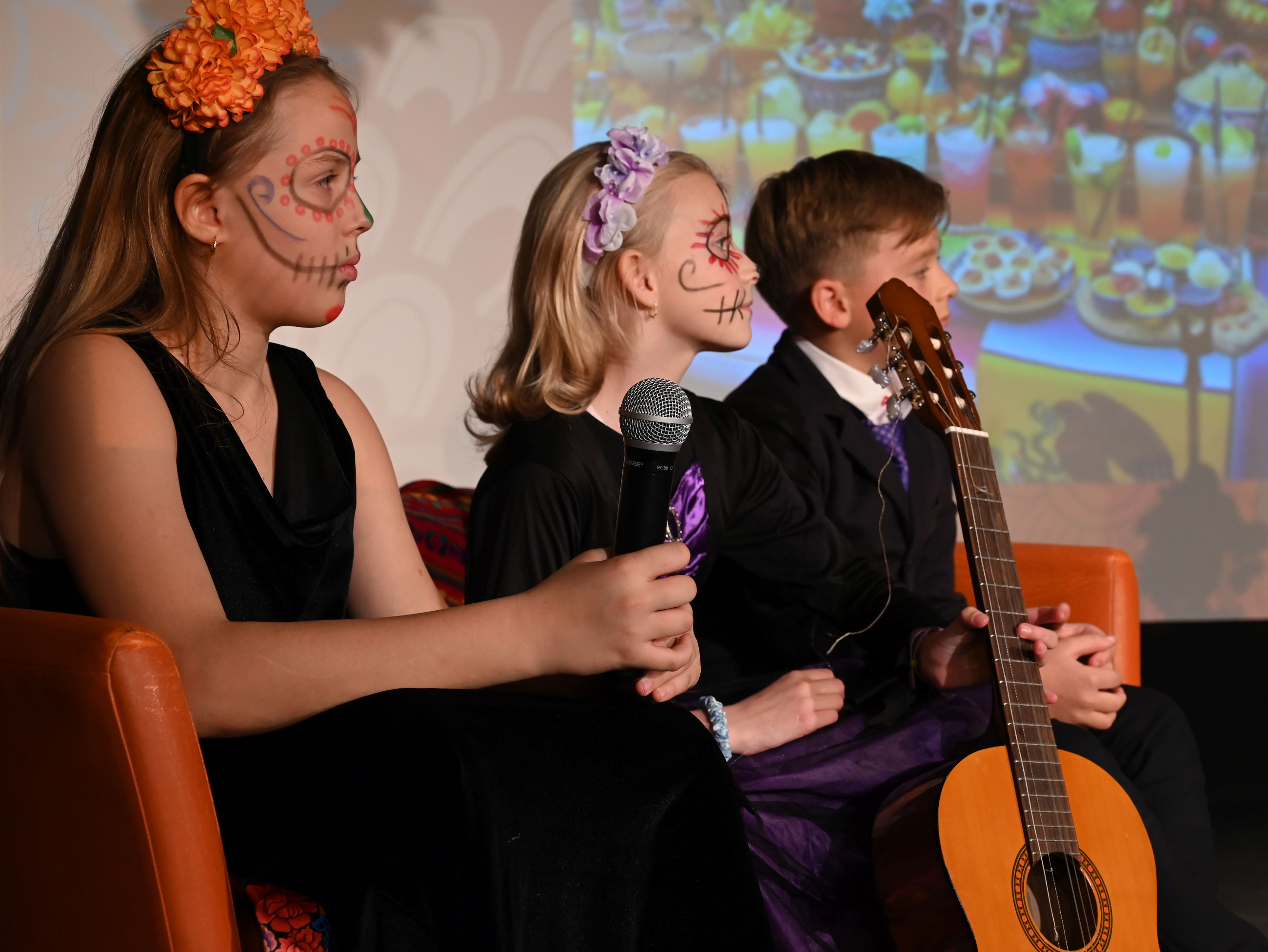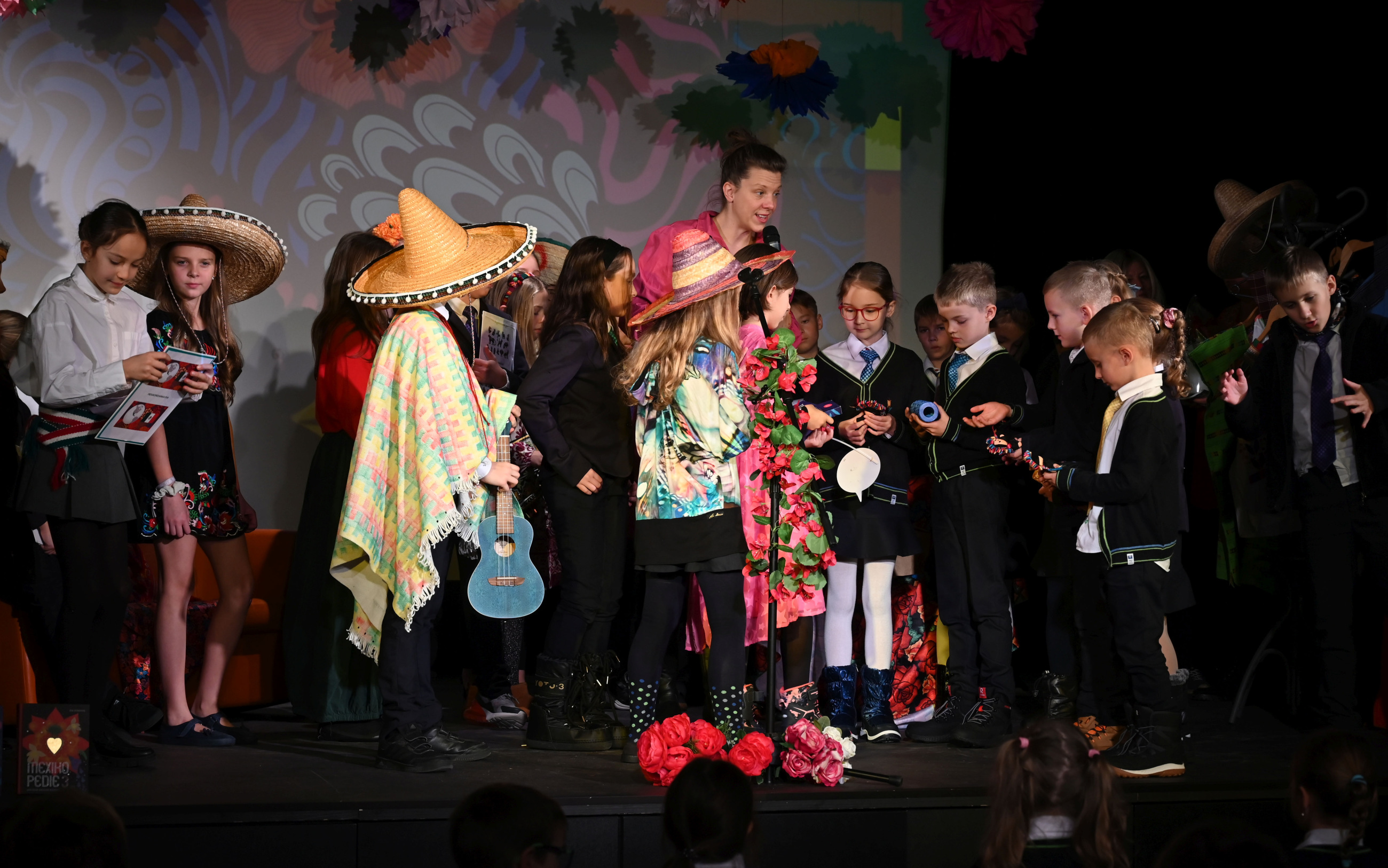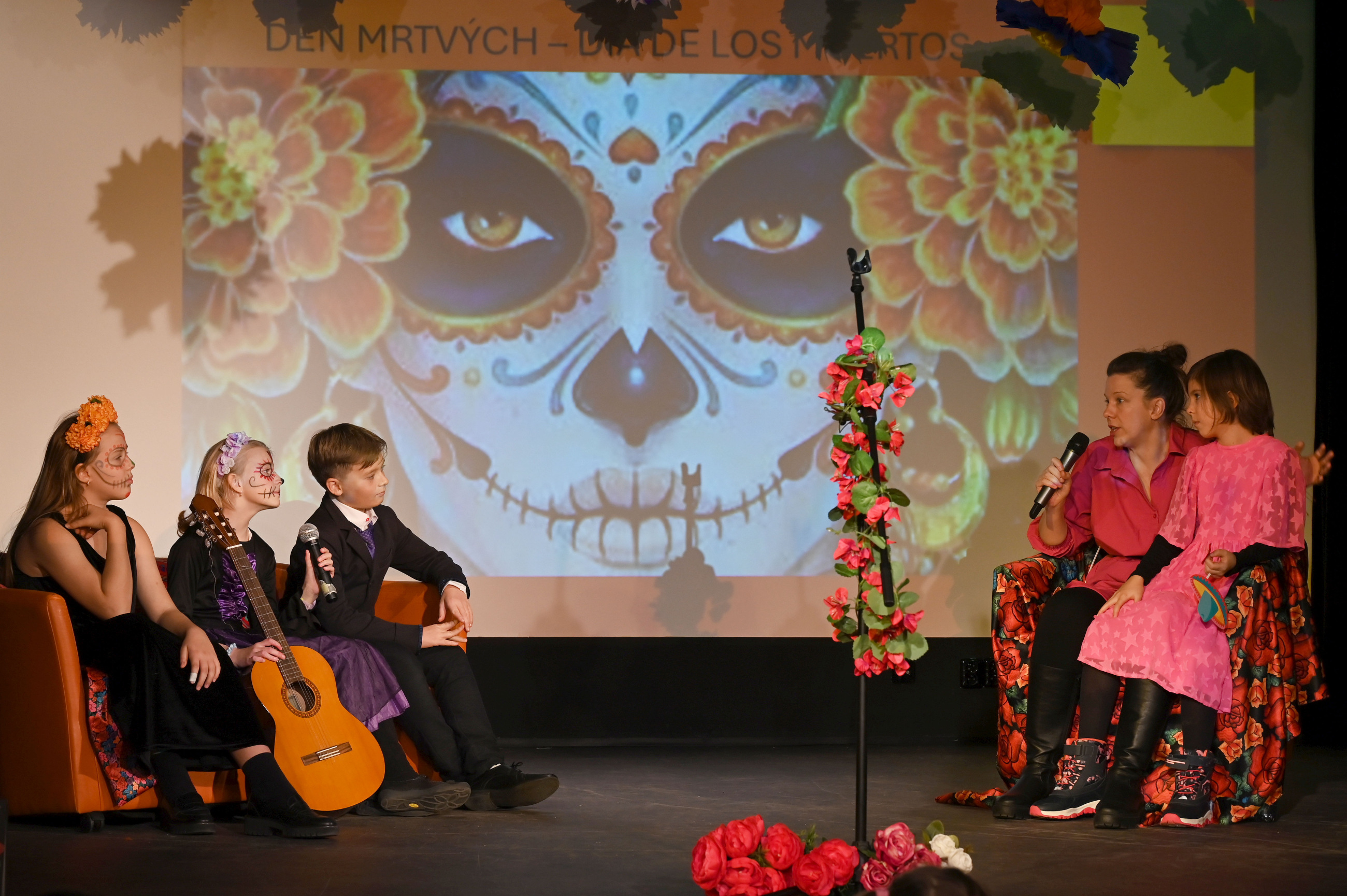 Středeční dopoledne naplnilo setkání na společné assembly v režii páté třídy. Hned při příchodu všechny okouzlila pestrobarevná scénografie plná dekorací květin, kaktusů, mexické vlajky a kostýmů. Povídat o Mexiku nám přišli ti nejpovolanější. Páťáci vyzpovídali historičku, spisovatelku a sběratelku mexických podivností Evu Kubátovou a její dceru Aničku, která se v Mexiku narodila. Dozvěděli jsme se nespočet zajímavých informací o mexické přírodě, kultuře, oblečení nebo jídle. V angličtině nám představili mexické dušičky a pobavili nás dramatizací prastaré legendy o vánoční hvězdě. Páťáci odvedli skvělou práci a do poutavého rozhovoru zapojili zpěv, tanec, divadlo i módní přehlídku.