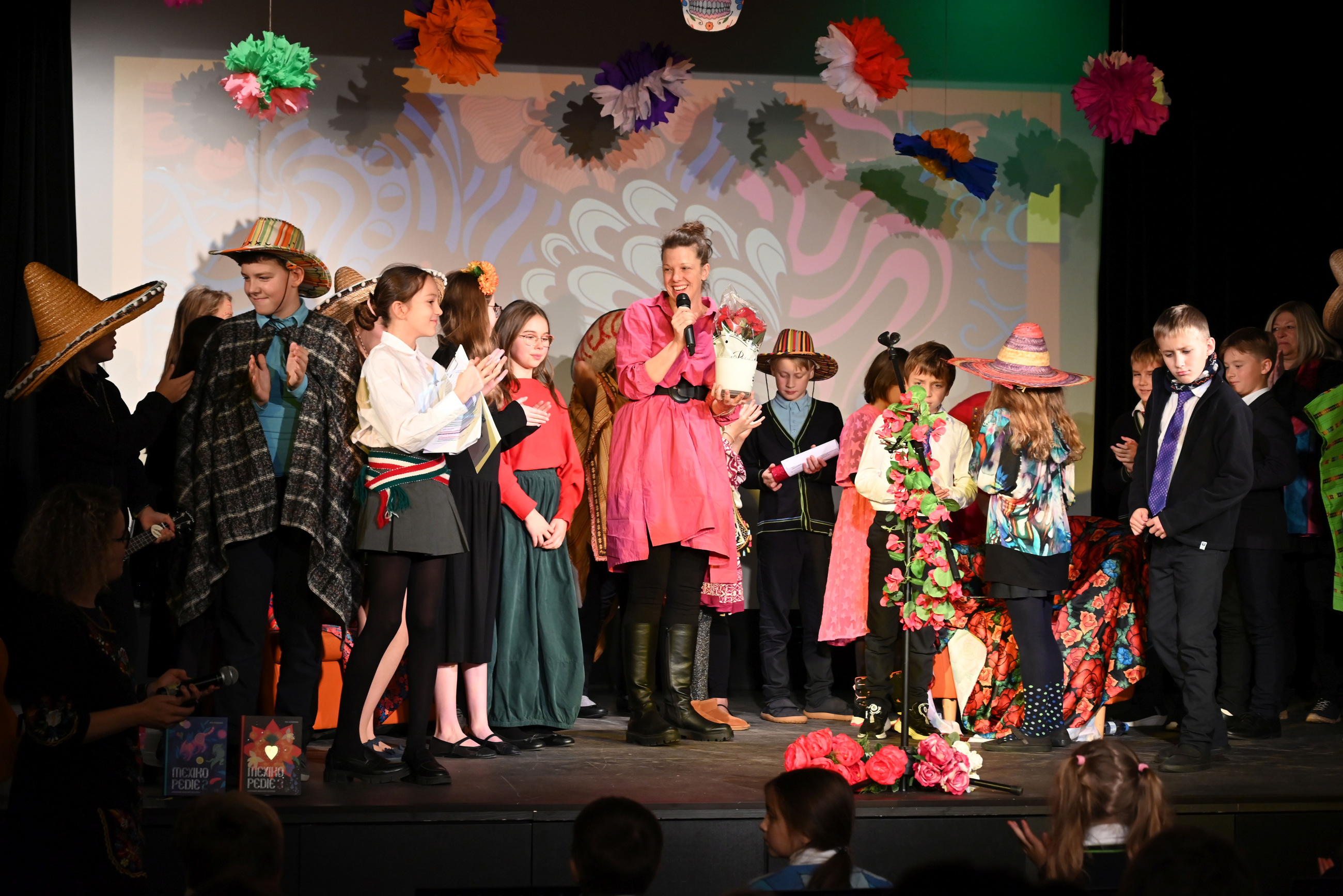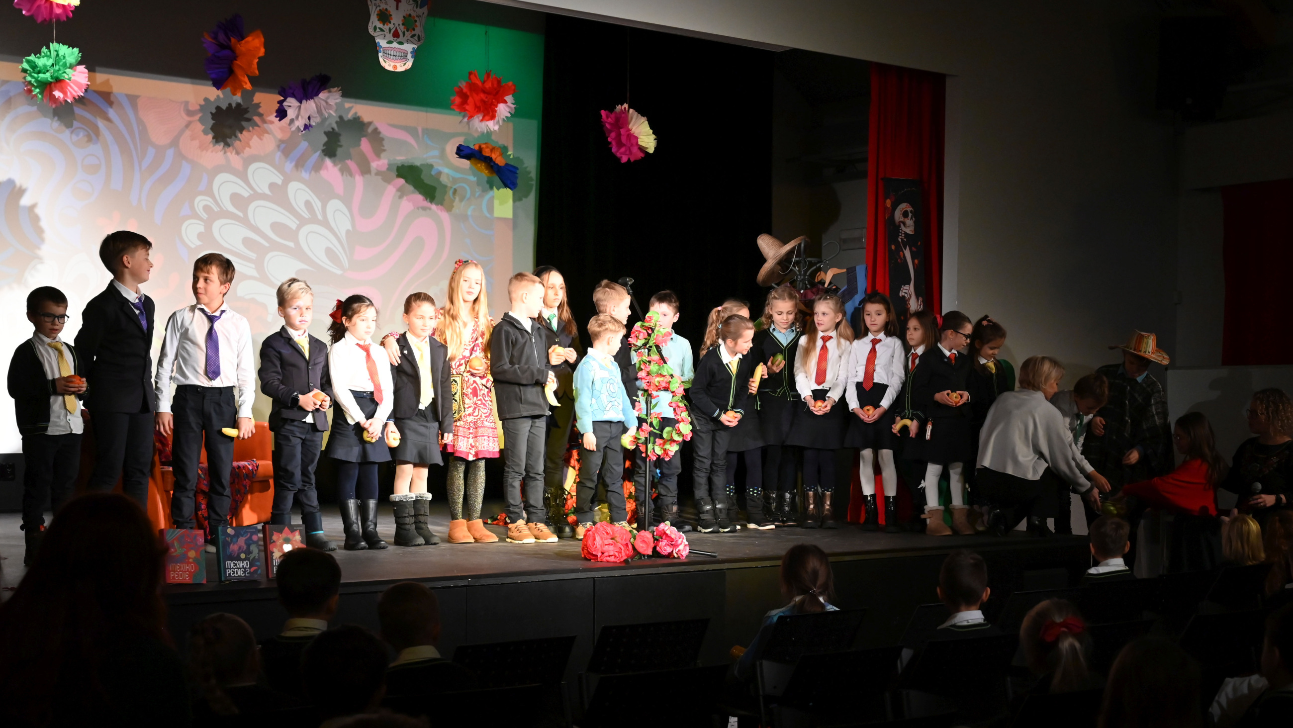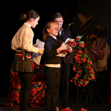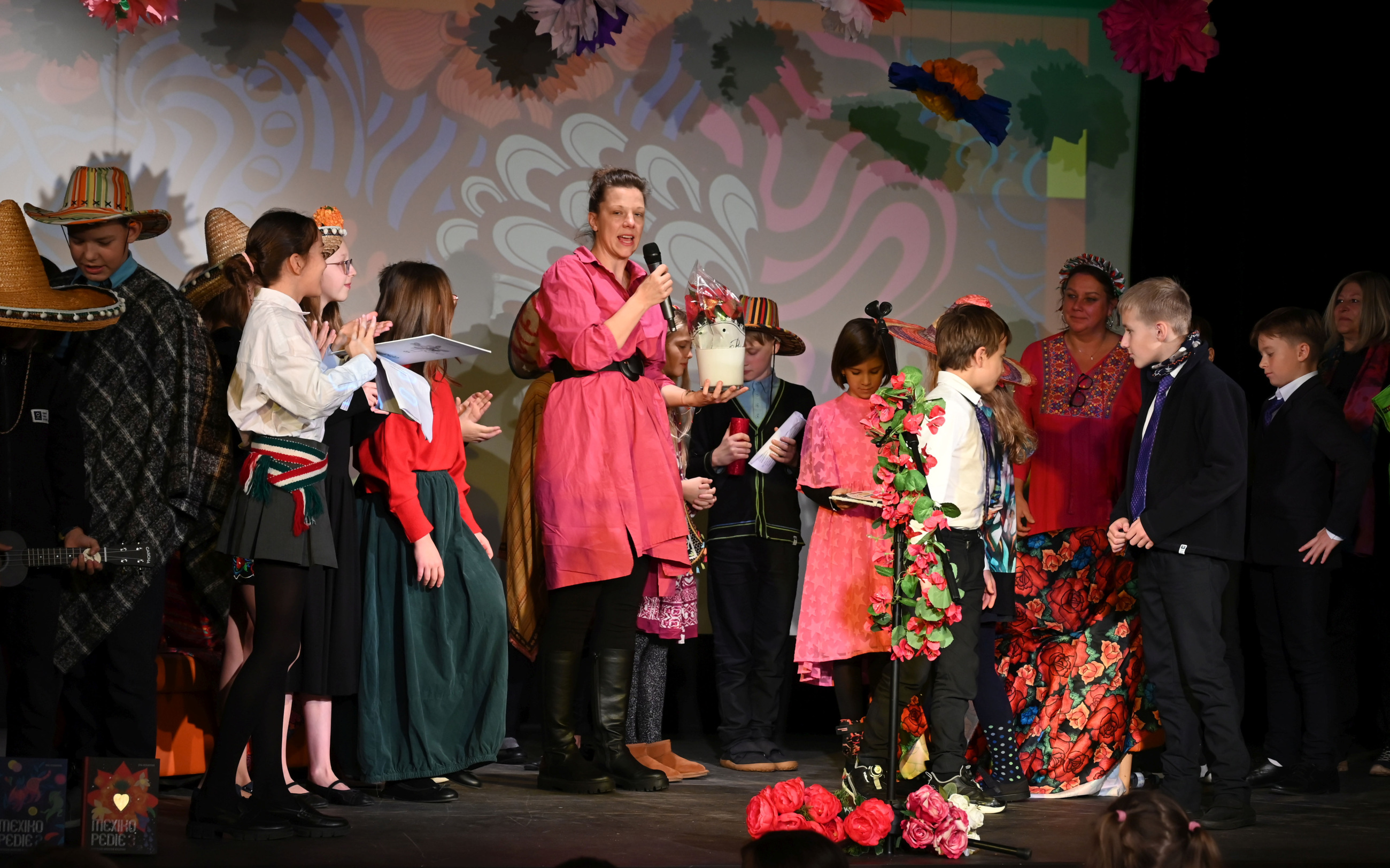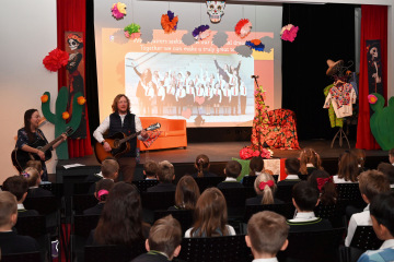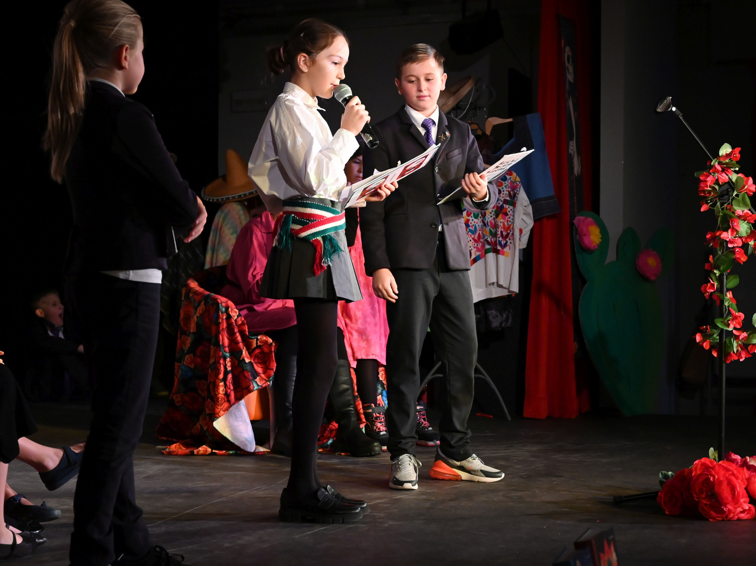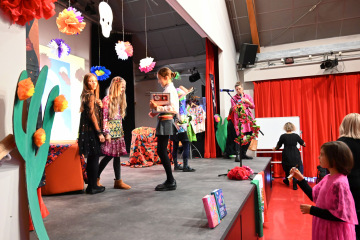 Středeční dopoledne naplnilo setkání na společné assembly v režii páté třídy. Hned při příchodu všechny okouzlila pestrobarevná scénografie plná dekorací květin, kaktusů, mexické vlajky a kostýmů. Povídat o Mexiku nám přišli ti nejpovolanější. Páťáci vyzpovídali historičku, spisovatelku a sběratelku mexických podivností Evu Kubátovou a její dceru Aničku, která se v Mexiku narodila. Dozvěděli jsme se nespočet zajímavých informací o mexické přírodě, kultuře, oblečení nebo jídle. V angličtině nám představili mexické dušičky a pobavili nás dramatizací prastaré legendy o vánoční hvězdě. Páťáci odvedli skvělou práci a do poutavého rozhovoru zapojili zpěv, tanec, divadlo i módní přehlídku.