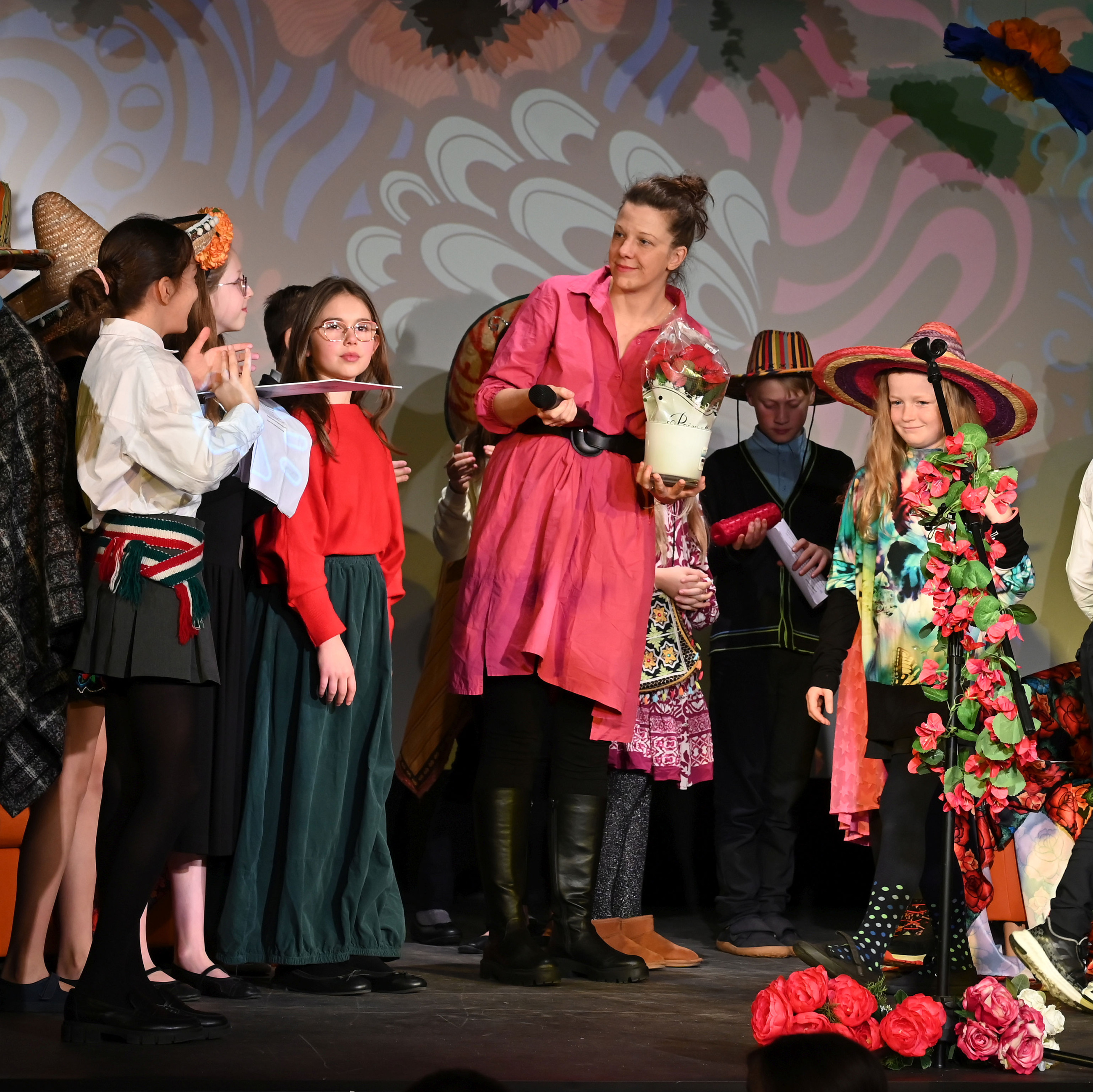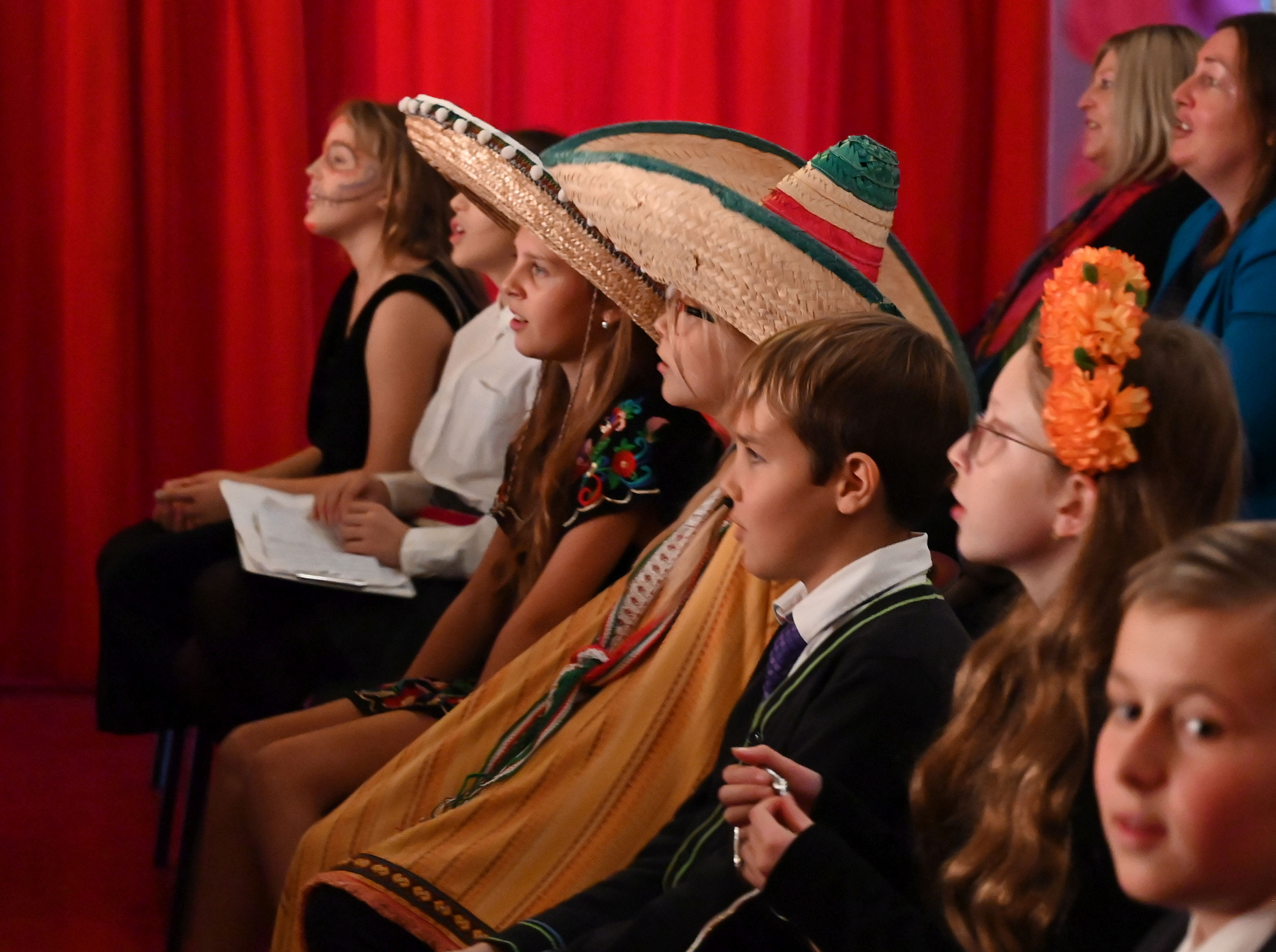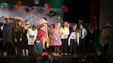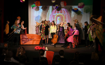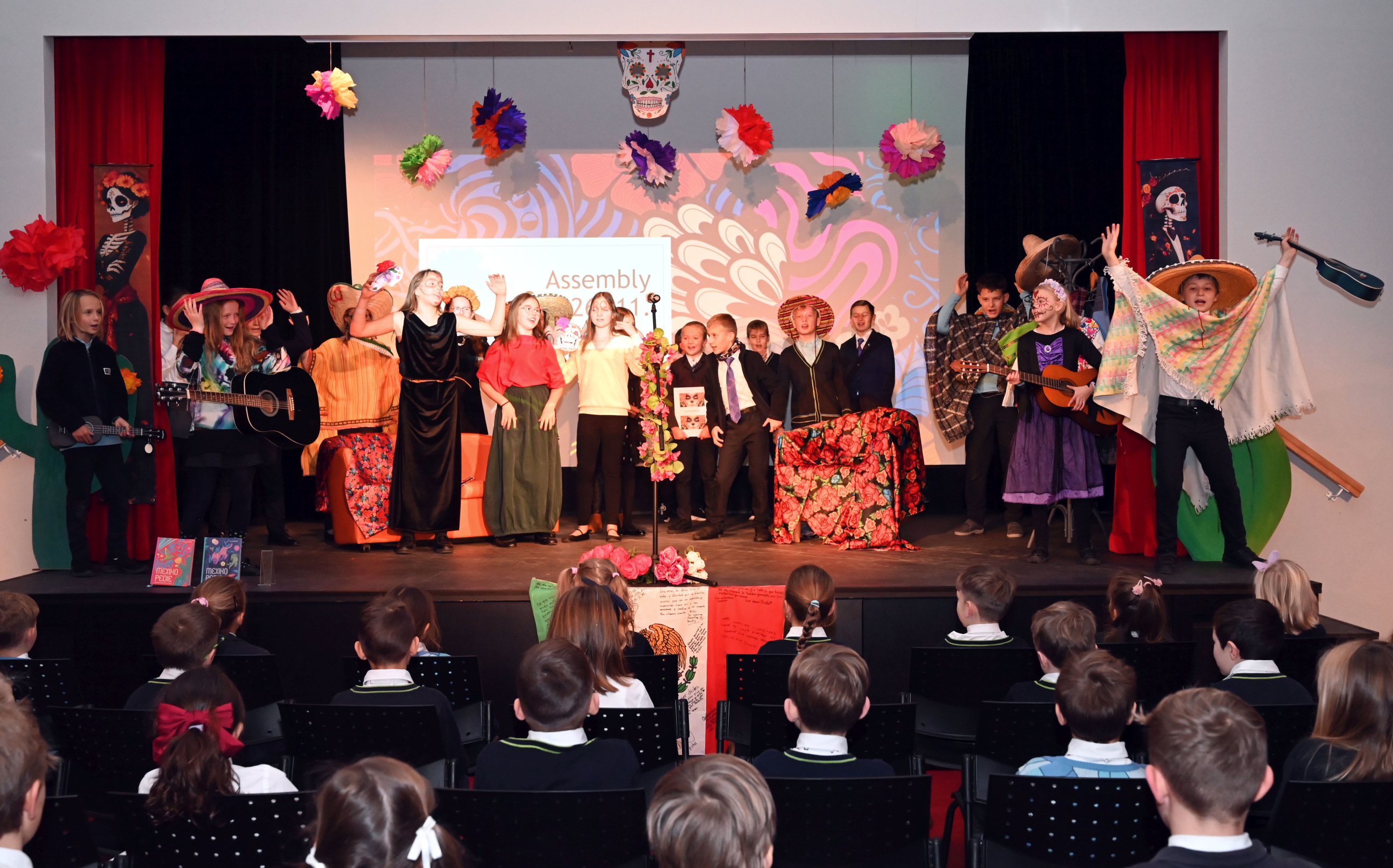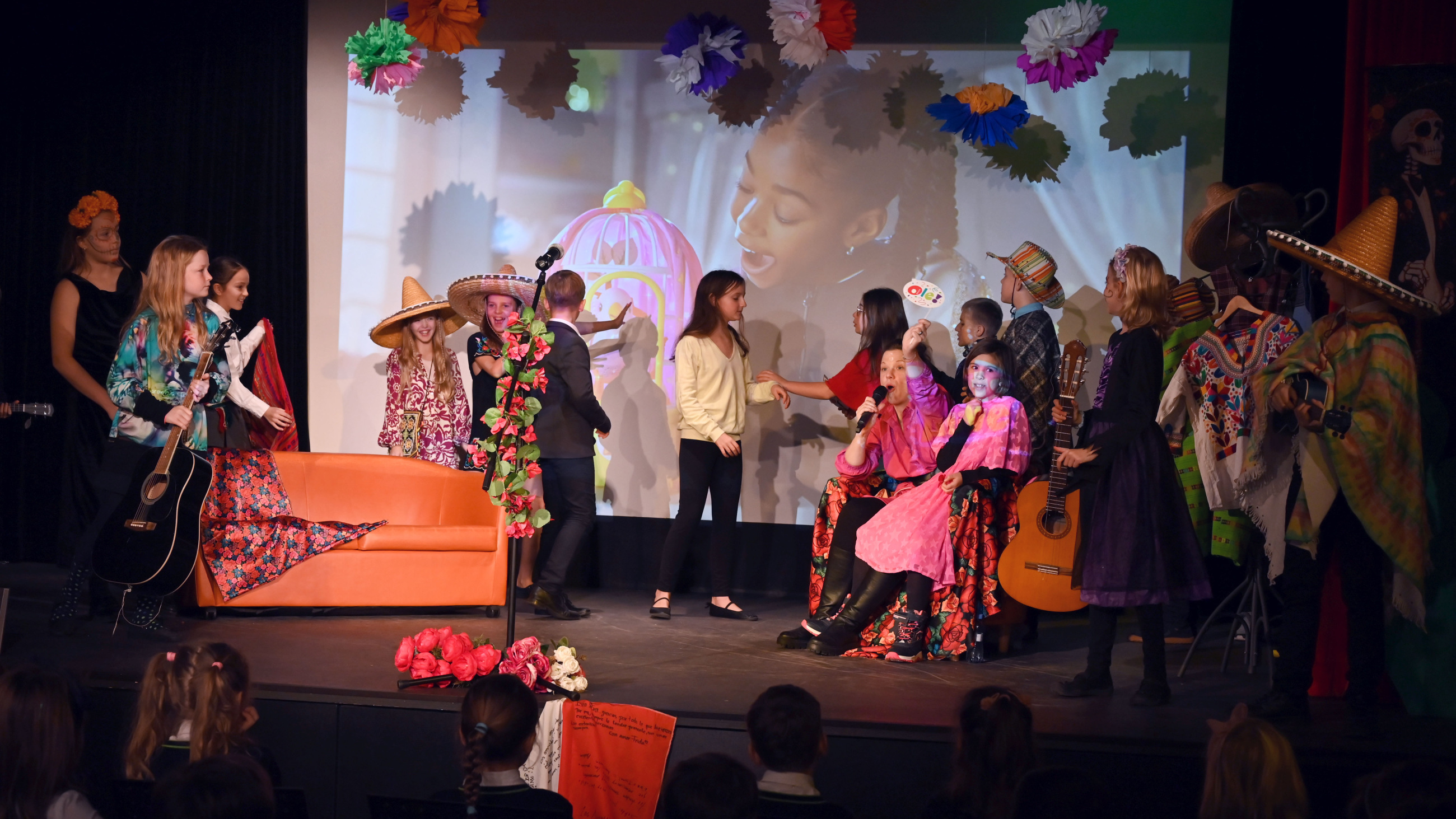 Středeční dopoledne naplnilo setkání na společné assembly v režii páté třídy. Hned při příchodu všechny okouzlila pestrobarevná scénografie plná dekorací květin, kaktusů, mexické vlajky a kostýmů. Povídat o Mexiku nám přišli ti nejpovolanější. Páťáci vyzpovídali historičku, spisovatelku a sběratelku mexických podivností Evu Kubátovou a její dceru Aničku, která se v Mexiku narodila. Dozvěděli jsme se nespočet zajímavých informací o mexické přírodě, kultuře, oblečení nebo jídle. V angličtině nám představili mexické dušičky a pobavili nás dramatizací prastaré legendy o vánoční hvězdě. Páťáci odvedli skvělou práci a do poutavého rozhovoru zapojili zpěv, tanec, divadlo i módní přehlídku.