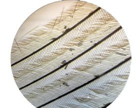 Dalším krokem bylo pozorování vytvořených preparátů pod mikroskopem. Začali jsme s malým přiblížením (40 x 10), kdy můžeme dobře vidět strukturu brka a větviček. To, co nás ale zajímalo, byly háčky, jejichž struktura je pořádně vidět až při vyšším zvětšení, a tak jsme se pustili do imerzní mikroskopie s cedrovým olejem.