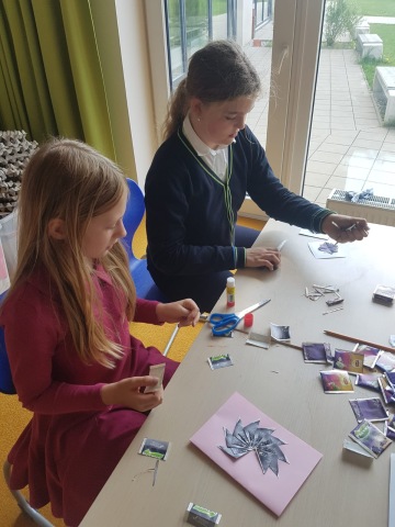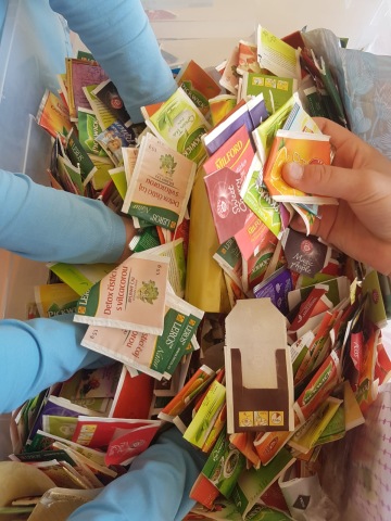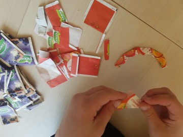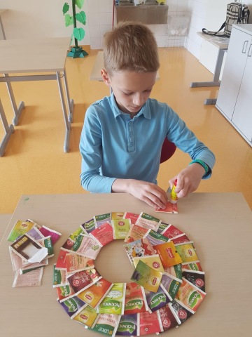 Na kroužku výtvarných experimentů jsme s dětmi pracovali se zdánlivě obyčejným materiálem - papírovými obaly od čajových sáčků. Pro někoho věc, která automaticky končí v koši, pro naše tvořivé děti hotový zázrak. Stačila chvilka a v jejich rukou začaly vznikat zajímavé ornamenty. Všechny působily naprosto originálně. Záleží totiž nejen na tom, pro jaký druh sáčků se rozhodneme, ale také na jeho poskládání a sestavení do výsledného motivu. Stačí jen drobné pootočeni a celý výsledný efekt je úplně jiný. A tak děti stříhaly, precizně skládaly a zkoušely různé varianty obrazců.