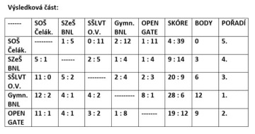 V prvním zápase po hektickém prvním poločase se ustálily tři kompletní čtyřky, které rozehraný zápas proti Střední zemědělské škole z Brandýsa nad Labem dovedly do vítězného konce v poměru 4:1. Ve druhém zápase naši hoši nastoupili proti Střední škole letecké a výpočetní techniky z Odoleny Vody. Tento zápas byl mnohem vyrovnanější a skončil 4:2 v náš prospěch. Třetí zápas byl rozhodující. Tým Gymnázia J. S. Machara z Brandýsa nad Labem předváděl v předchozích zápasech krásnou hru a bylo jasné, že vítěz z toho souboje se stane i celkovým vítězem a postupujícím do krajského kola. Naši kluci nastoupili s respektem a přesvědčením, že mohou uspět, leč realita byla jiná. Zápas skončil debaklem 1:8. Poslední čtvrtý zápas naši odehráli s pocitem jistoty druhého místa proti Střední odborné škole z Čelákovic. Zlepšili si náladu a vyhráli 11:1.