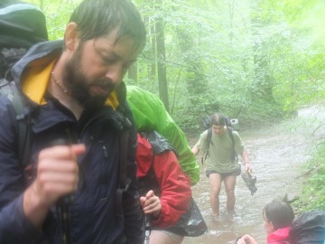 Ještě před obědem jsme kvůli neprošlapané cestě museli brodit řeku, a protože to nešlo jinak, hned několikrát. A tak jsme překročili Rubikon. Kostky jsou vrženy. Když vyhladovělí osmkrát brodíte řeku s plnou krosnou na zádech, ve chvíli, kdy máte vody po kolena, máte vody po krk. Navíc někteří z nás neměli boty na přezutí a šli vodou bosí.