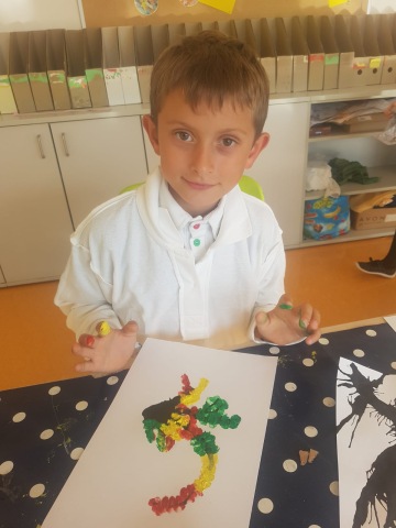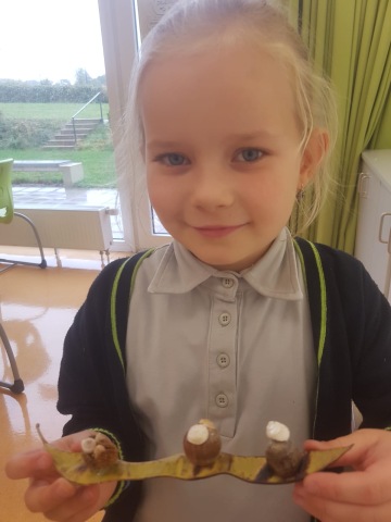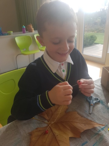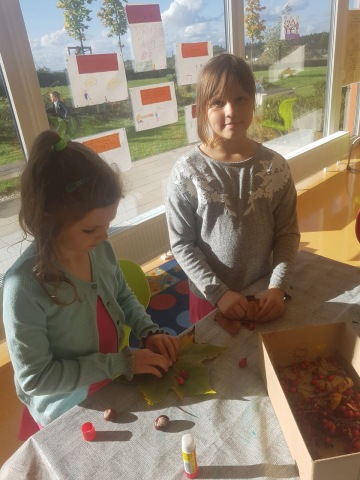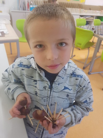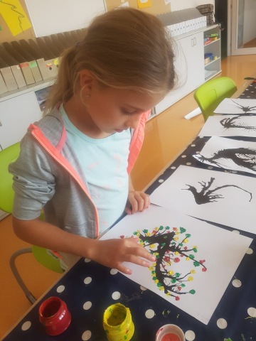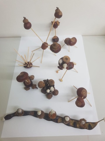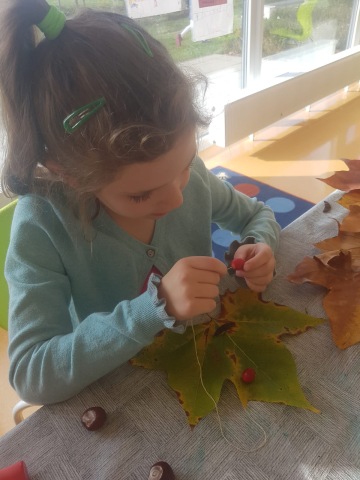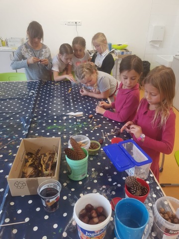 S dětmi ve družině jsme se nechali inspirovat nádherně barevnou podzimní přírodou a pracovali jsme na několika různorodých plošných i prostorových výtvarných projektech. Tvořili jsme s tuší v kombinaci s prstovými barvami, kdy jsme ztvárnili šípkové keře. Pracovali jsme s přírodními materiály, jako jsou šišky, kaštany, žaludy, semínka apod. Udělali jsme z nich mnoho rozličných tvorů, zvířátek a závěsných dekorací. Prstíčky jsme si také procvičovali při práci s jehlou a nití, kdy jsme navlékali jeřabiny. Podzimní atmosféra tedy zavládla i v naší družině.