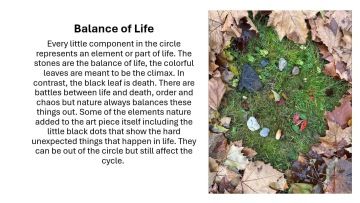 V rámci přípravy na praktickou část lekce jsme se dívali na dokument „Forest, Field, and Sky: Art Out of Nature“ a zaměřili se na témata, jako je krása, pomíjivost a využití přírodních materiálů. Dílo Andyho Goldsworthyho Red Leaf Patch bylo klíčovým příkladem toho, jak přírodní cykly změn a rozpadu ovlivňují jeho tvorbu.