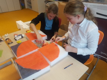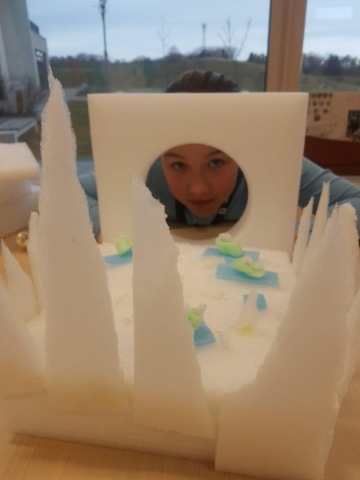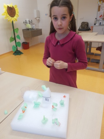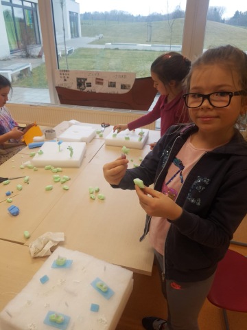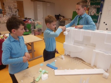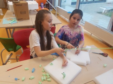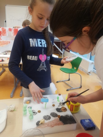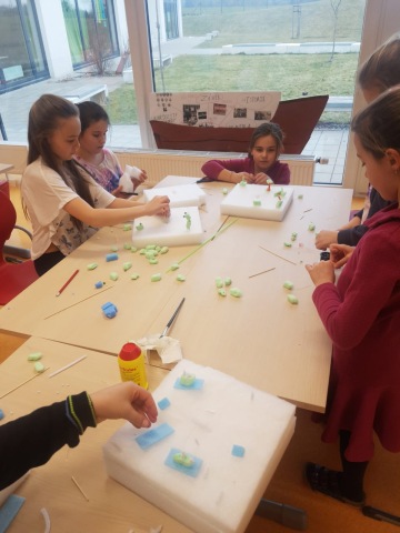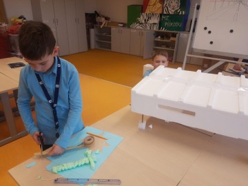 Poslední dvě lekce jsme se s dětmi ve výtvarných experimentech věnovali tvorbě "mimozemských civilizací". Pro práci jsme využili různé druhy materiálů, jako například polystyren, špejle, brčka, dráty, papír, korálky apod. Velké polystyrenové desky posloužily jako základní stavební prvky, některé děti upravily jejich tvar, jiné je barvily akrylovými barvami. Na takto připravené povrchy pak děti umisťovaly nejrůznější mimozemské postavy, dopravní prostředky a další vesmírné objekty. Jejich fantazie a kreativita neznala mezí...