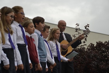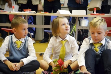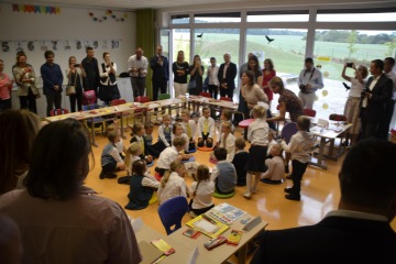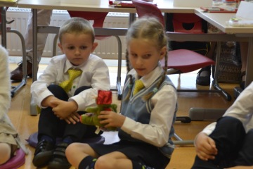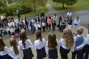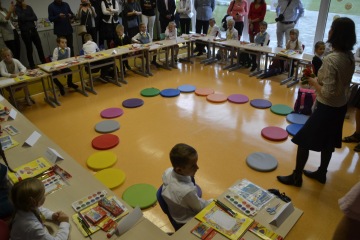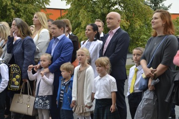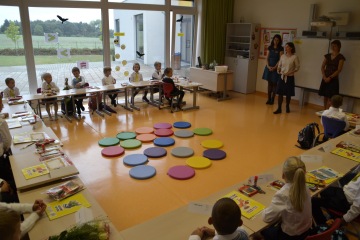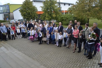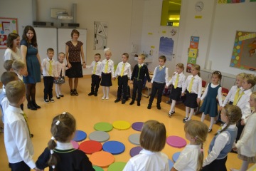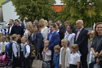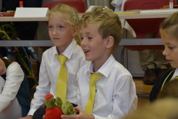 Setkali jsme se ve foyer základní školy a přesunuli se společně s již tradičními průvodci prvňáků – žáky pátých tříd – na schody před základní školu. Prvňáčci se nejprve drželi svých rodičů a vzhlíželi ke svým starším budoucím kamarádům. Po úvodním slovu pana ředitele a zpěvu školní hymny se prvňáčci připojili k páťákům a přesunuli se do třídy, kde měli za úkol najít své místečko. Pod vedením paní učitelky Jolanky a Jany a za asistence Moniky pak secvičili krátkou báseň a prvně se ve škole podepsali – a že to umíme, to jste si, milí rodiče, mohli všimnout hned po svém příchodu do třídy.