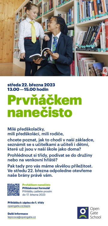 Zápis proběhne v první polovině dubna. V průběhu března Vám sdělíme konkrétní termín, kdy se na Vás a Vaše dítě budeme těšit ve škole. Před samotným zápisem bychom Vás rádi upozornili na kritéria přijetí do ZŠ Open Gate.