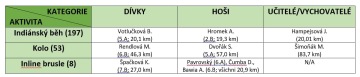 A jak jsme nakonec dopadli? Co říkají údaje v dotazníku? To ví Klauz… Po třech dnech usilovné práce strávené vyhodnocováním přijatých dat tímto oficiálně zveřejňujeme neoficiální výsledky. Z úctyhodných 270 zaznamenaných odpovědí patřilo 7,4 % učitelům a vychovatelům. Z toho vyplývá, že účast ze strany studentů byla po odečtení řádně omluvených téměř stoprocentní! Nejlepších výsledků ve třech nejobsazenějších aktivitách, kdy běh a chůze byly z praktických důvodů sloučeny do aktivity nazvané „indiánský běh“, dosáhli tito studenti a učitelé/vychovatelé (v závorce u aktivit je uveden počet účastníků):