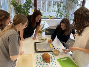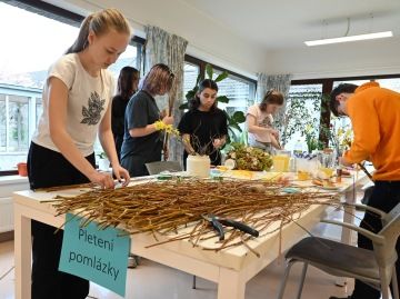I v tomto roce jsme pro studenty na kolejích připravili dílny věnované tradicím a velikonočním svátkům. V 15:30 dorazili první studenti a rozhlíželi se, co že jsme si to na ně tentokrát nachystali. Alenka připravila těsto na jidáše, které studenti vytvarovali dle svých představ a před pečením ozdobili hřebíčkem a potřeli vajíčkem. Než se jim tato sladká dobrota upekla, mohli zasít osení do připravených nádob. Další stanoviště, kde studenti strávili trochu více času, bylo pletení pomlázek. Tomáš byl jejich trpělivým průvodcem a rádcem, jelikož uplést pomlázku z tolika proutků (rozuměj 6, 8, 9 nebo 12) není vůbec žádná legrace. Všem se to ale nakonec povedlo. Na dalším stanovišti si studenti mohli vyzkoušet barvení vajec neobvyklou technikou: fixami pokreslili ubrousek a následně do něj vajíčka zabalili. Celé to ponořili do octa. Po uschnutí vznikla taková umělecká díla, jaká můžete vidět na fotce (za tu děkujeme Patricii Pejsarové). V závěru dílen na studenty čekaly čerstvě upečené jidáše, za tepla potřené medem, a také vyborné muffiny, které pro nás upekla Lucka. Ty si studenti ozdobili čerstvě vyšlehanou šlehačkou a posypali lentilkami. V 17:00 jsme pískli start naší novinky: velikonočního fotbalového turnaje. Sešly se tři týmy a na fairplay hru dohlíželi tři rozhodčí – Honza Kopřiva, Sam Rodný a Tadeáš Týc. Dle mého laického oka zápasy spravedlivě dovedli do zdárného konce. Po skončení všech utkání se vyhlásili vítězové, rozdaly se ceny a všichni se spokojeně rozprchli za svými zájmy. Doufám, že se v příštím roce najdou i fotbalistky, které klukům konečně ukážou, jak se fotbal opravdu hraje. :-) |