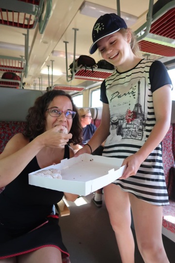 Již na počátku jsme na sebe upoutali pozornost, když se žáci rozhodli nabídnout osazenstvu vagonu domácí koblihy od paní Ivanové (za všech 150 děkujeme!!!). Cestující si nás sice zpočátku pletli s vlakovým personálem nebo brigádníky nejmenovaného politického hnutí, ale nakonec všem výborně chutnalo. Včetně kolegyně Perekopské, což dokazuje úvodní fotografie v galerii.