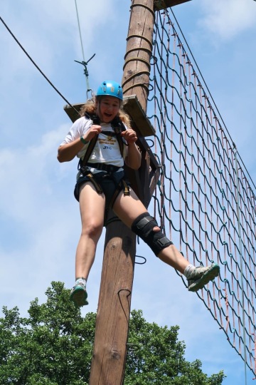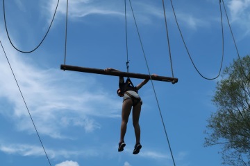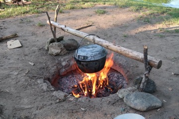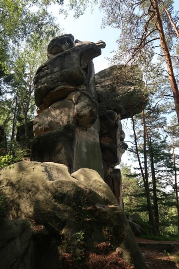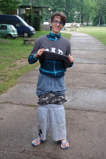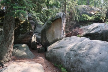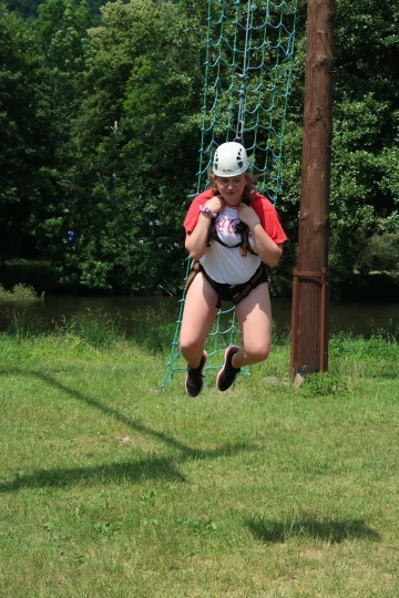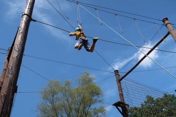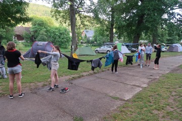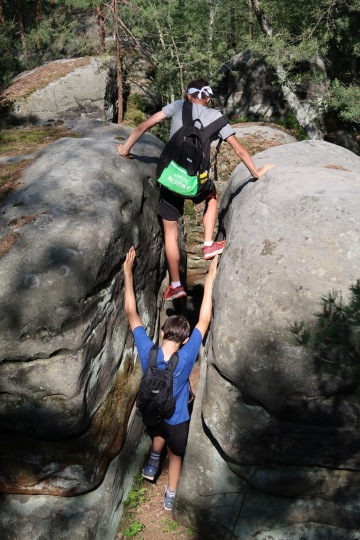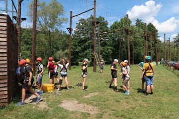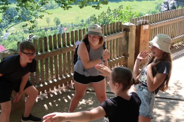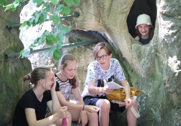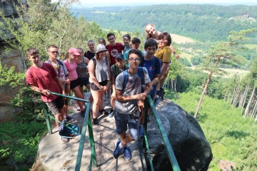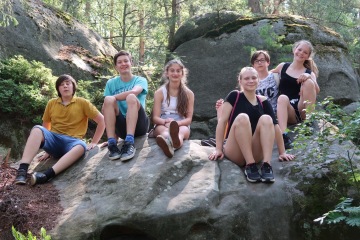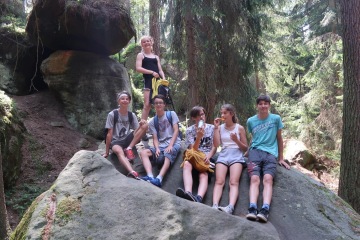 Druhý den následoval výstup ke skalnímu bludišti Kalich - Chléviště. Skály byly za protireformace útočištěm pronásledovaných nekatolíků. Připomíná je vytesaný kalich s letopočtem 1634. Našli jsme tu mimo jiné i jeskyni exulanta V. Sadovského. Romanticko-mýtická atmosféra celého místa přímo vybízela k parádní honičce nebo parkourovému tréninku. Odpoledne nás čekalo lanové centrum, kde žáci v rekordním čase zlezli všechny nachystané překážky. Kvůli velikému vedru následovalo koupání na jezu, kde třída svedla bitvu o vor s vetřelci z Turnova. O průběhu a metodách boje však historie (raději) nic nezaznamenala. Někdy je lepší některé věci prostě nevědět. Vedro ovšem večer vystřídal déšť a třída musela uspořádat Blitz-Abendbrot. Opékání buřtů muselo kmitat, ale nakonec se opět až na pár drobných přešlapů vše povedlo. Večer se část žáků rozhodla spát pod širákem.