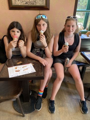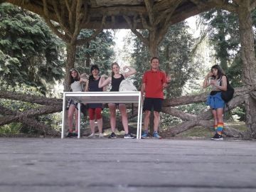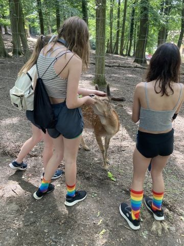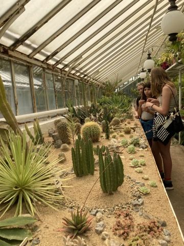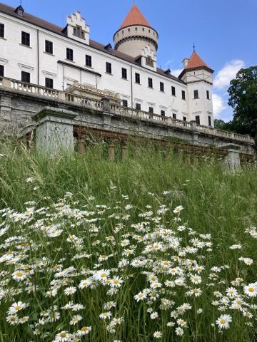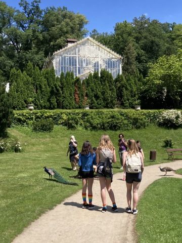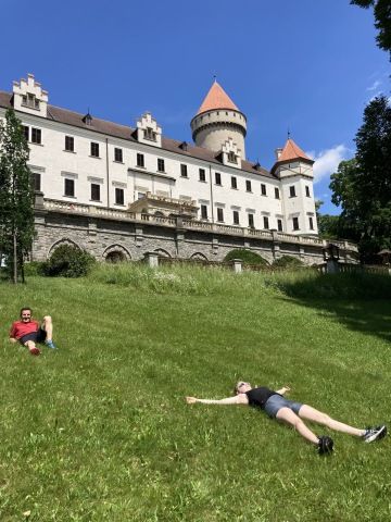 Všem to hezky uběhlo, a tak jsme se mohli vrhnout na lavičce s výhledem na zámek za zvuků v korunách stromů ukrytých pávů do vlastnoručně, ještě v OG připravených plněných tortill. Po dějepisném vzdělávání a poobědovém odpočinku a válení sudů na zámecké louce následovala zoologie a botanika. Přemístili jsme se do růžového sadu, kde byla většina růží ještě v poupatech, ale konečně jsme uviděli ty pávy, pobíhající po cestičkách mezi záhony. Tolik barev na jednom živočichovi, jako má páv, hned tak nenajdete. Následná návštěva skleníku s tropickými rostlinami byla jedním z největších zážitků pro Markétu s Lili, které si vytvářely v improvizované písečné poušti s miniaturami kaktusů a palem krásné příběhy. V tomto skleníkovém prostředí se už viděly někde na Sahaře. Pak jsme udělali skupinové foto v korkovém pavilónu, opravdu byl celý jenom z korku, a přesunuli se ke Konopišťskému rybníku. Někteří si pod vedením pana vychovatele vyzuli boty a šli vyzkoušet vodu. V krátkých kalhotách byla vyhlášena soutěž, kdo dojde dále, kterou ale nekompromisně vyhrály Markéta s Lili, které šly nejdříve jen na okraj kalhot, pak už po pás a skončily namočené úplně celé. Tu vodu si opravdu užívaly, nehledě na to, že byly ve vodě v kalhotách i v tričku.