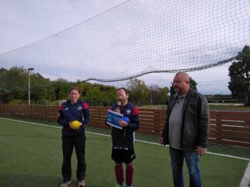 Předání daru se protáhlo také proto, že jsme jej chtěli s fotbalisty prožít ne u Zeleného stolu, nýbrž přímo při jejich utkáních. Toho jsme se dočkali až minulou sobotu (23. září 2023) v nádherném sportovním areálu v Březiněvsi, který obec zdarma přenechává nevidomým k organizaci turnaje evropských parametrů (kromě našich – BSC Praha – také Schalke 04, Slask Wroclaw, Ingolstadt, LASS Budapešť, Liguria Calcio a FC Nates). Bohužel tento víkend na kolejích OG nemohli zůstat žádní kolejní studenti, aby se mnou do Březiněvsi v rámci víkendového programu zavítali a osobně finanční dar v hodnotě nádherných 10 649 Kč fotbalistům a vedení ČSZPS předali. Učinil jsem tak já a moje dcery. Bylo neuvěřitelným zážitkem vidět hráče, rozhodčí, moderátory, fanoušky a organizátory v akci. Se Zdeňkem Barlokem, předsedou Českého svazu zrakově postižených sportovců, jsme prodiskutovali část pravidel; například proč brankář vidí, proč nevládne „návist“ mezi celky Prahy a Brna, proč hráči při pohybu křičí španělské VOY, VOY nebo proč má míč uvnitř rolničku…