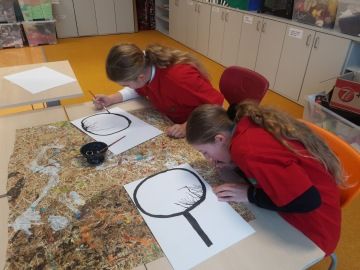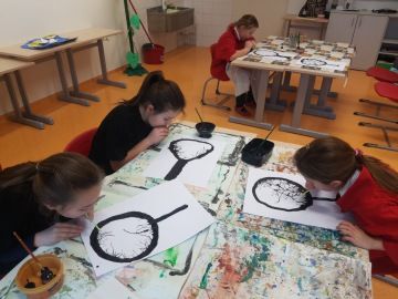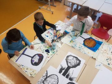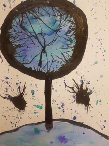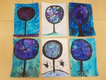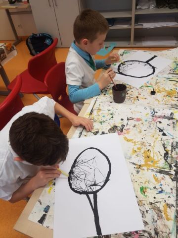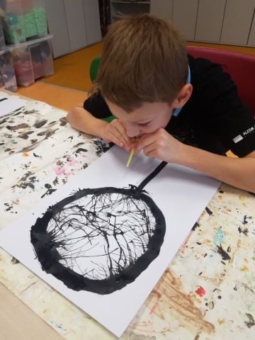 Poslední dvě lekce jsme se věnovali kresbě stromů v zimě. Nejprve jsme kreslili tuší. Udělali jsme velikou korunu stromu ve tvaru elipsy a silný kmen. Poté jsme se za pomoci brček pokoušeli tuš rozfoukat tak, abychom vytvořili dojem různě propletených větví stromu. Tato část práce děti velmi zaujala a bylo zajímavé pozorovat, jak odlišné struktury vznikají, ačkoli všechny děti pracovaly stejnou technikou.
