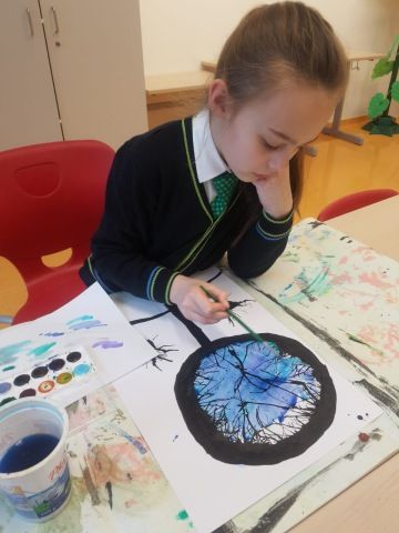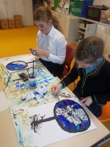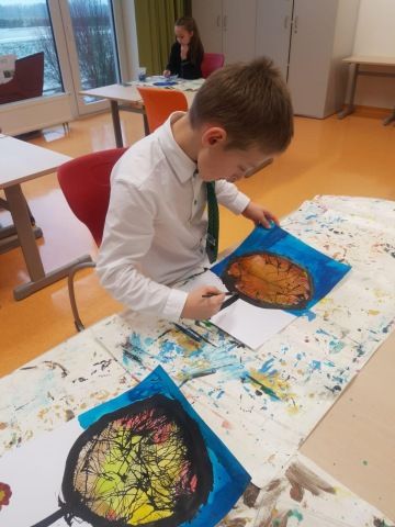 Následující hodinu přišla řada na kolorování anilínovými barvami. Děti měly malovat v omezené barevné škále, ale s rozmanitými tóny. Kladením barev se snažily podpořit strukturu větví a nakonec barevně zpracovat i pozadí.