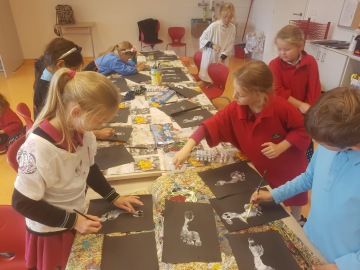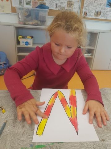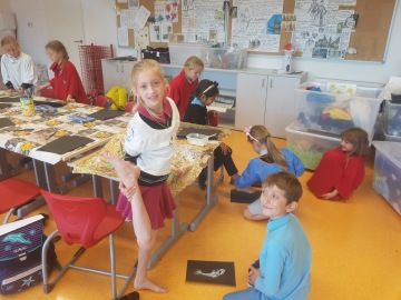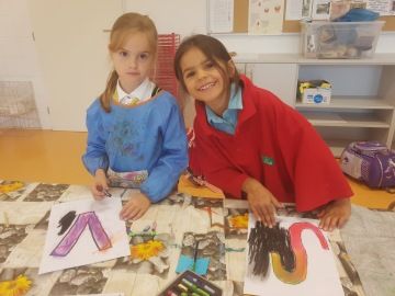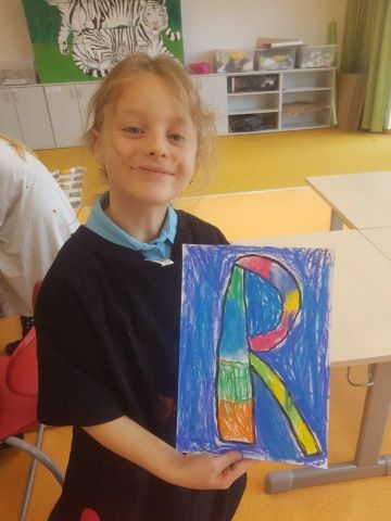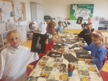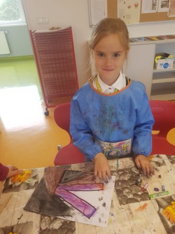 Děti, které si jako páteční volitelný předmět vybraly "Výtvarný svět", již úspěšně zvládly úvodní lekce. Na začátek jsme se rozhodli výtvarně zpracovat název našeho předmětu. Každý si zvolil jedno písmeno, kreslili jsme suchými pastely, seznámili se s mícháním barev a stínováním.