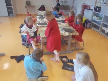 Když se přiblížil Halloween, pustili jsme se do malování strašidel. Navzájem jsme si pomalovali chodidla bílou barvou, otiskli je na čistý černý papír a po zaschnutí domalovali detaily. Děti báječně spolupracovaly a ani po nás nezůstaly bílé stopy na lině.