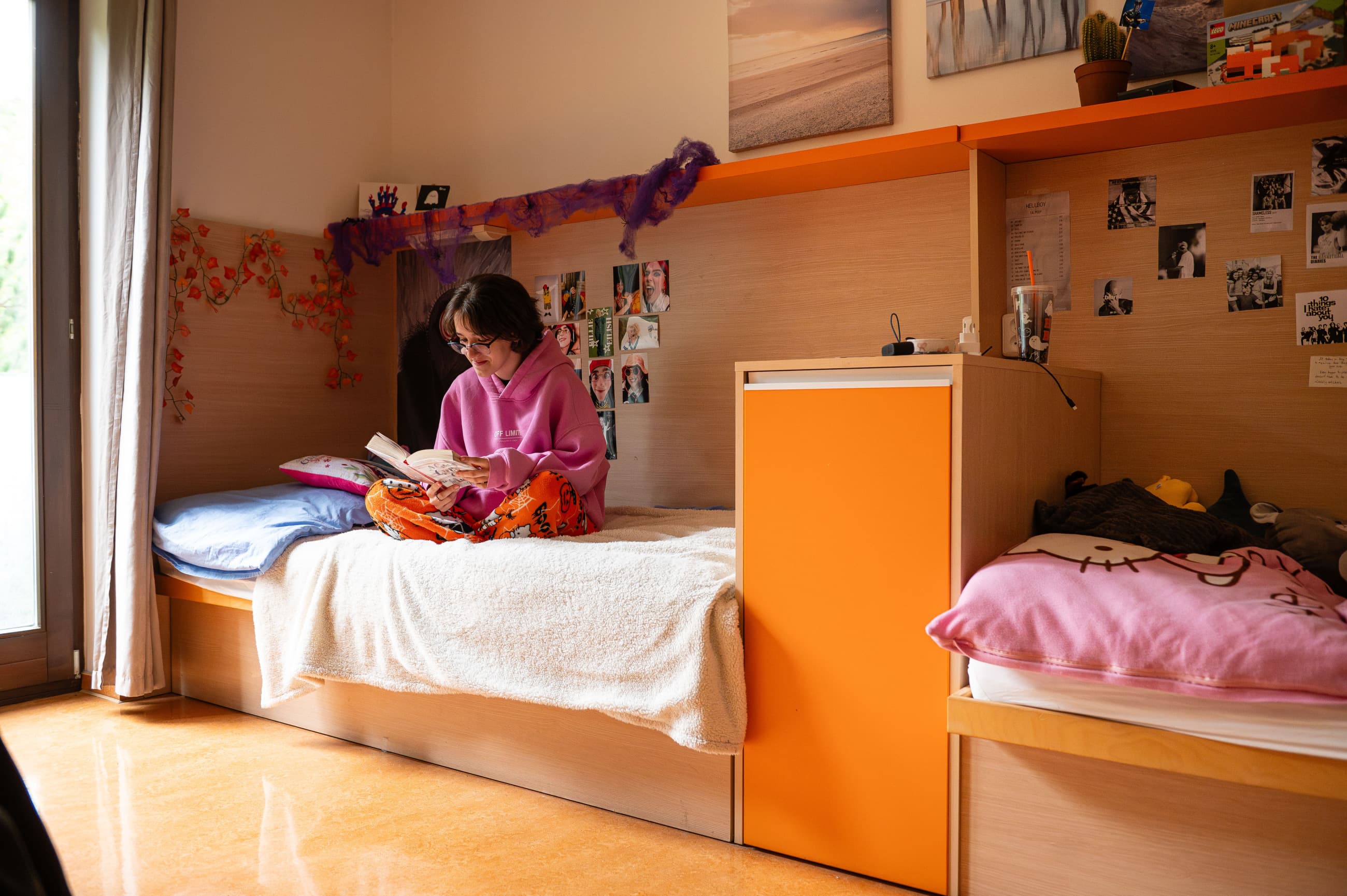 Most rooms in the boarding houses are double rooms. They receive plenty of natural light and feature large windows overlooking the garden. Each student has a comfortable bed, a bookshelf, shelves, a personal desk, and a wardrobe. The bathrooms are shared between two adjacent rooms, where four students meet.