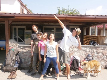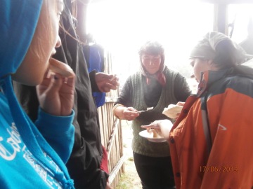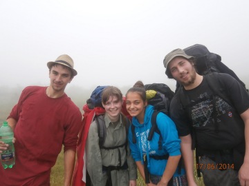 We - David, Matyas, Dominika, Kristina and Sara - started on Tuesday, 17th June 2014. We started from the Czech village of Eibenthal and continued upwards to a hill Znamana. The weather was terrible - it was so foggy that we could not see more than 15 meters and the wetness of the grass (it rained the day before) caused that our trousers and shoes were soaked. On top of that, we got lost. However, we found the yellow sign again. We went around a herd of cows with a bull which mooed at us, so we continued very quickly and arrived at a cow’s shelter. There we met two local Romanian women who cared about the cows and also two women from another Czech village, Bigr. We tasted cheese that was made there, hid from the rain and observed how the staff tried to make a bull (probably the one that scared us) mate with a cow belonging to the women from Bigr. Even though it was fascinating, it did not work well and the rain stopped, so the women from Bigr decided to go home. Since our journey was in the same direction, we went with them (and the cow), through a beech forest. The older woman, Veruna, was very talkative, so we heard a lot of information from her - how she visited the Czech Republic and what her favourite painkiller was. It was about 13 km to Bigar, but the quite skinny cow went quickly. In Bigr, we went around the church and a shop and continued around few crosses and dumps. It was late and it started to rain again, so we quickly found a place and built our tents. When the tents were standing, it stopped raining, so we made our dinner and decided that we will not be able to go according to plan the next day.