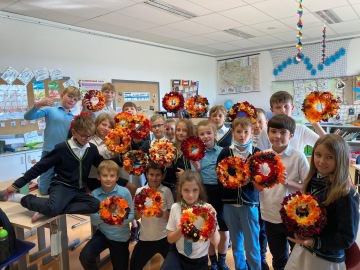 Class 4 are gradually adjusting to enrichment. Same as Class 5 last year, this subject is taught by Petra Kobrová, who cooperates with Marie Zicháčková this year. In enrichment, the children become familiar with strategies to solve problems in order to finish them within a time limit. They learn to be more self-reliant in approaching more difficult tasks, they build up their resilience and the ability to transform any potential failures into motivation for further learning. This week, the whole team created a beautiful autumn wreath, the making of which was a nice way to relax and take a break after difficult studying. They also visited Class 5 as a part of September revision, where they saw presentations about state symbols. In English, they discussed the historical context of the upcoming holiday. They explored Czech Republic and they also practiced the Past Simple tense in detail.