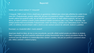 All of Class 4 became reporters for a while when they were conducting interviews with their family members. They were asking them what they were doing in November 1989 and whether they remember the events of the Velvet Revolution. Unfortunately, I cannot show you the videos and all the interviews, but they did a wonderful job – they could get a job on TV straight away. They learned from each other and they learned a lot of interesting information. I’d like to thank all the parents, grandparents and loved ones for their involvement in this project. And of course, thank you, Class 4 for your great work.