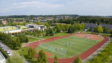 Sportujeme co nejvíce na čerstvém vzduchu, ať už na fotbalovém hřišti nebo jinde venku. Máme ale i velkou sportovní halu. Hrajeme tu florbal, volejbal i další sporty. Nechybí ani menší sály pro balet a jógu a skvěle vybavené fitness centrum.